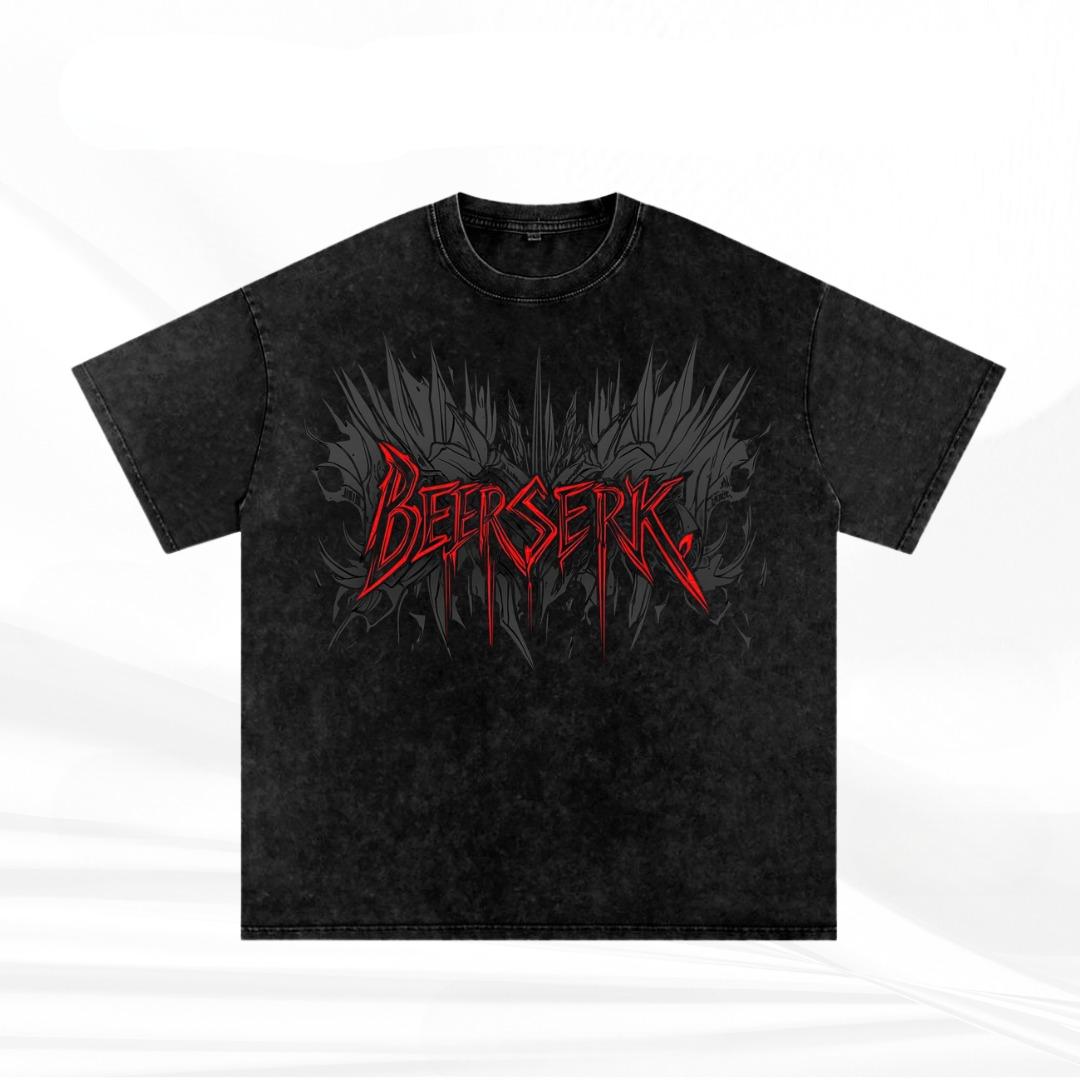 The Acid Wash Printed Drop Shoulder T-shirt blends a rugged vintage aesthetic with a modern, oversized silhouette. Featuring a jagged, blood-red "BERSERK" graphic set against a dark, sharp-edged backdrop, this piece is designed for those who want a standout streetwear statement with a relaxed feel.