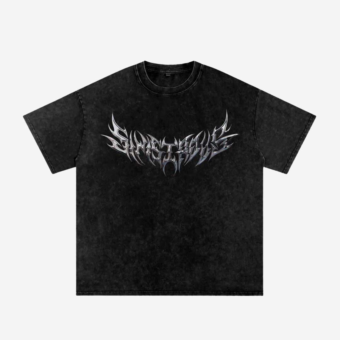 The Acid Wash Printed Drop Shoulder T-shirt blends a rugged vintage aesthetic with a modern, oversized silhouette. Featuring a sharp, metallic "SINISTER" chrome graphic across the chest, this piece is designed for those who want a standout streetwear statement with a relaxed feel.