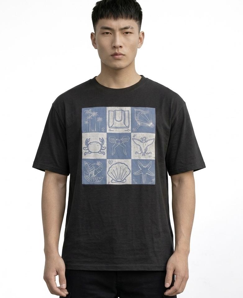 Aesthetic Grid Print Black Tee for Men