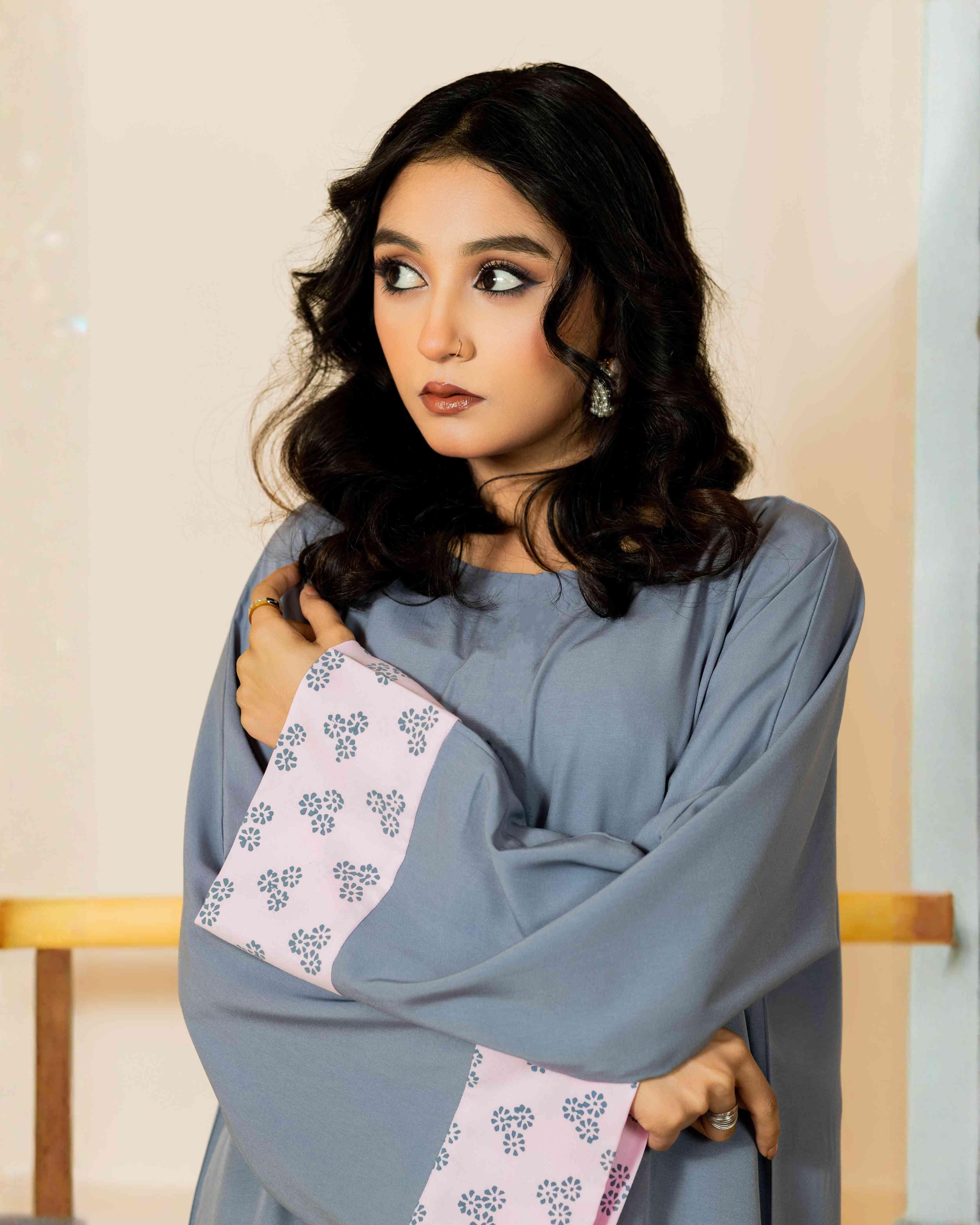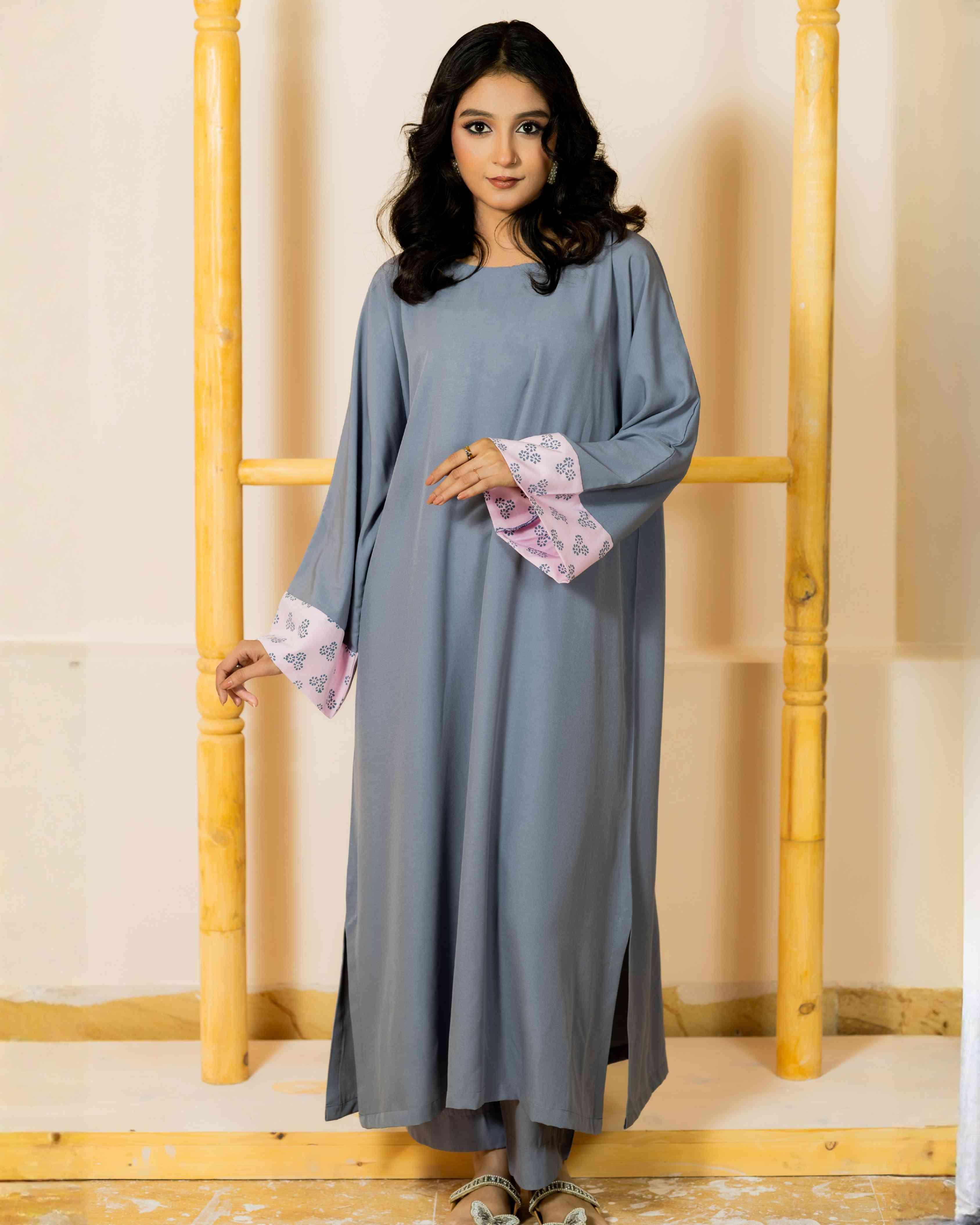 The set features a long A‑line kurti in a chic dim grey shade, thoughtfully designed with full sleeves and fabric-covered buttons along the neckline. A delicate hand flower print adds a subtle, feminine charm, making it versatile enough for both casual outings and relaxed gatherings. The coordinating bottoms complete the look, offering a seamless and comfortable fit.