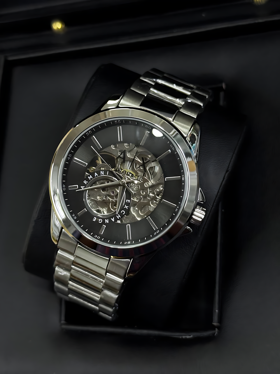 Armanii Skeleton Silver Black Stainless Steel Automatic Watch For Men