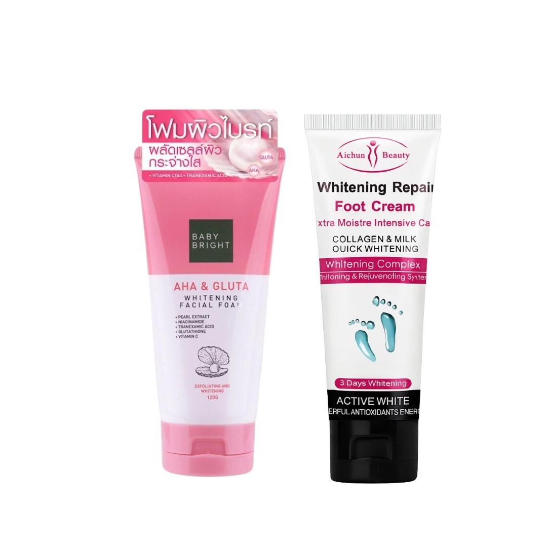 Refresh your entire skincare routine with this head-to-toe whitening and renewal combo. This set pairs the advanced exfoliating power of Baby Bright’s facial foam with the deep-repairing nourishment of Aichun Beauty’s specialized foot cream for a complete glow and smooth texture.