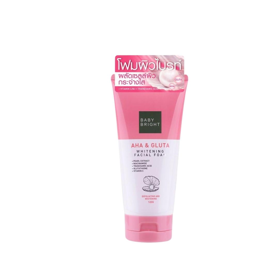 Baby Bright Facial Foam: Enriched with AHA, Glutathione, and Vitamin C to exfoliate, control oil, and brighten the complexion while reducing acne and dark spots.