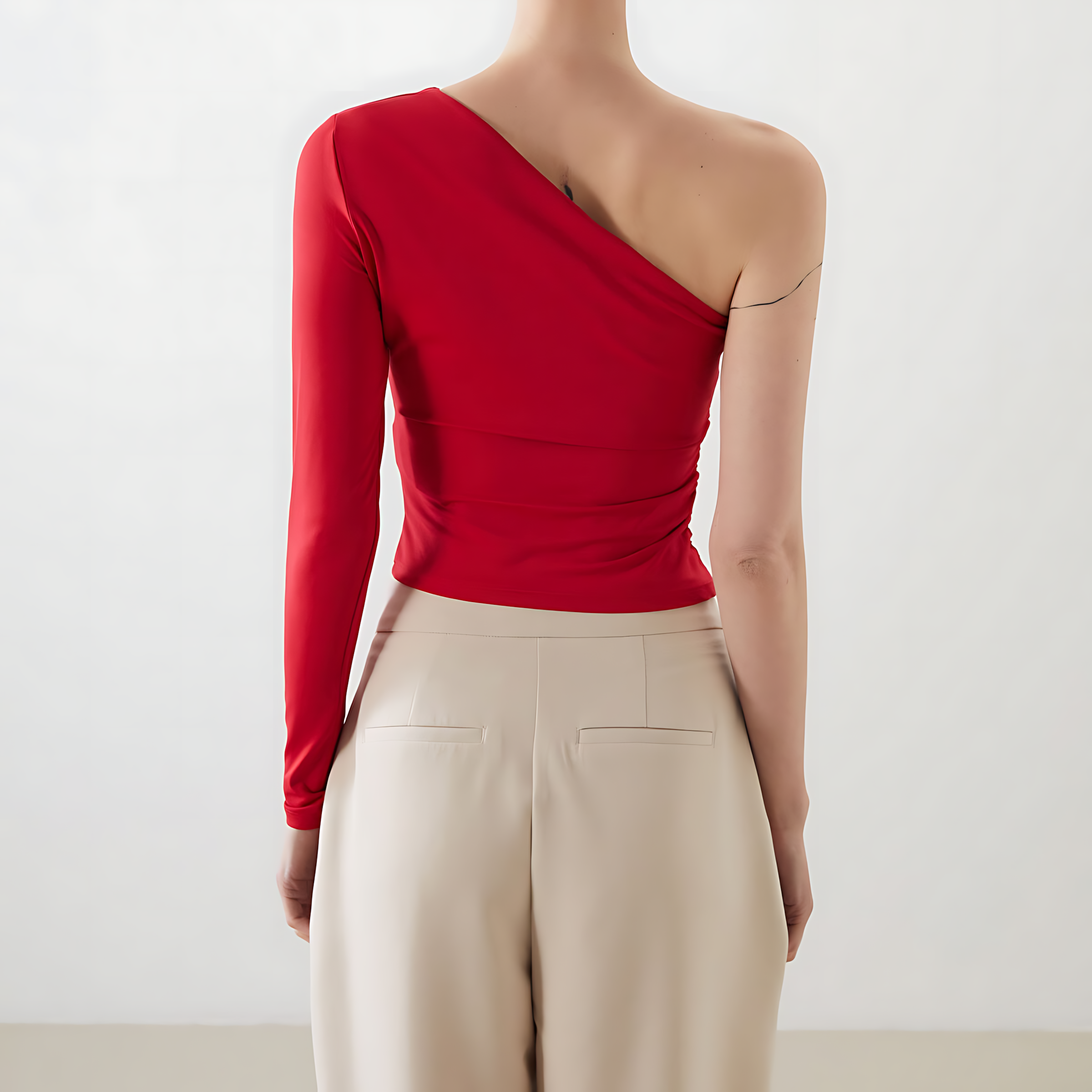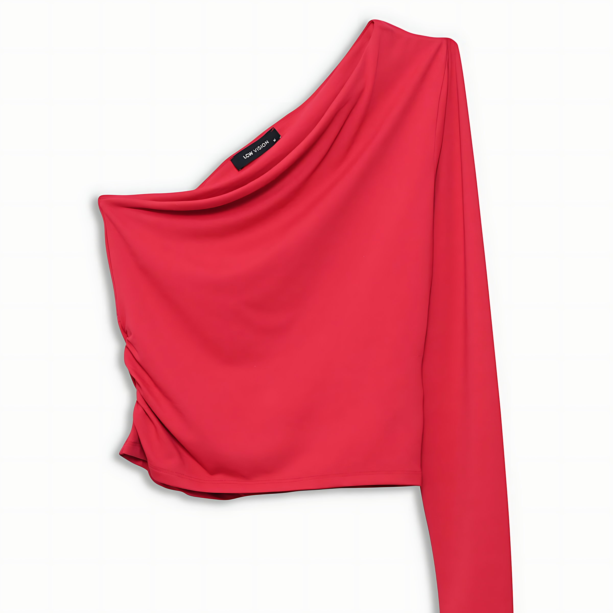 Make a bold statement with this vibrant chilli red crop top featuring a trendy one-shoulder slash neck design. Crafted from a soft viscose blend with medium thickness, it offers a perfect balance of comfort and high-fashion edge for any outing.