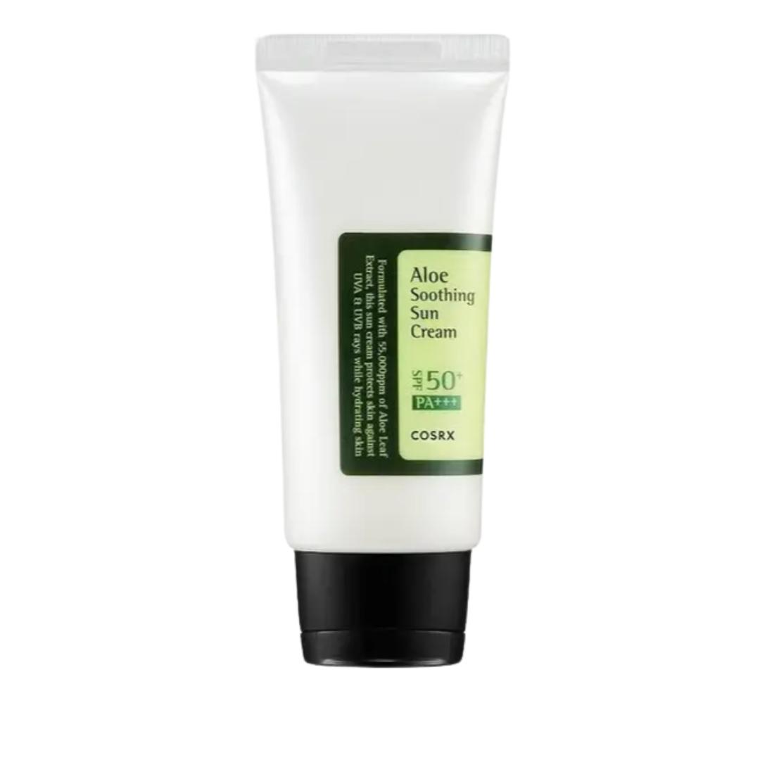COSRX Aloe Soothing Sun Cream SPF50+ PA+++ (50ml) – Korea: A daily sunscreen infused with 5,500ppm of Aloe Arborescens Leaf Extract. It provides broad-spectrum protection while simultaneously soothing and hydrating the skin.
