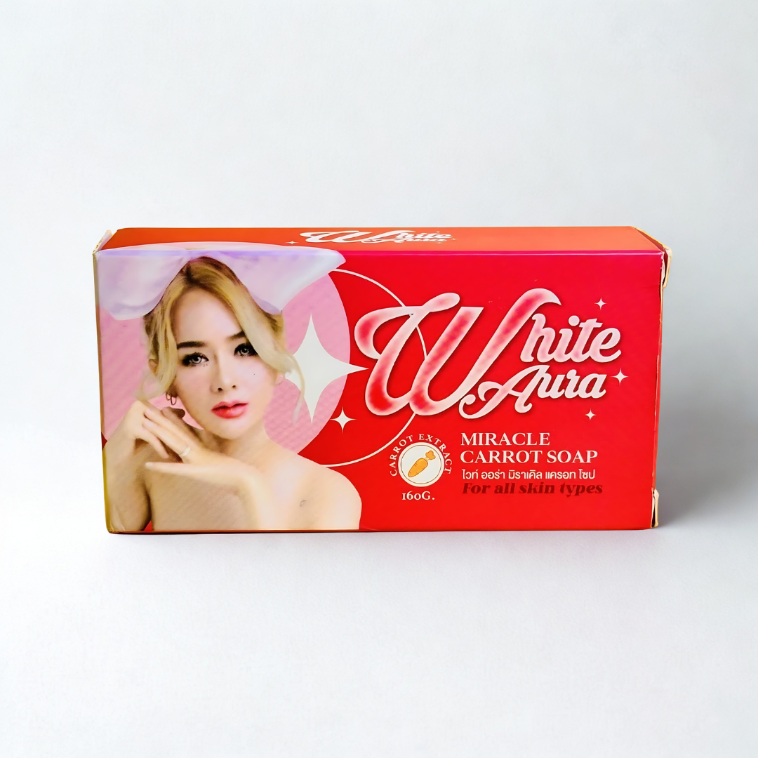 White Aura Miracle Carrot Soap (160g) – Thailand: A high-potency vitamin soap enriched with Carrot Extract to brighten and rejuvenate the skin.