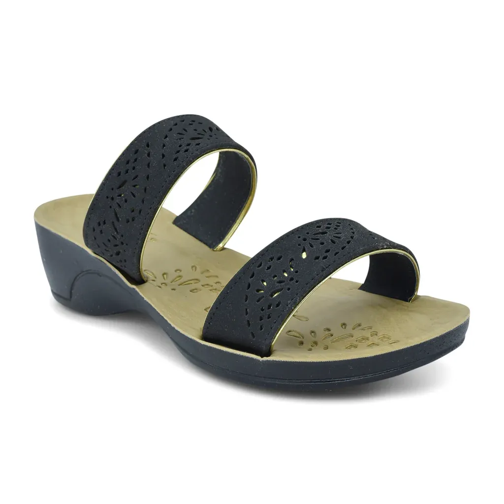 Slide into trendy style with these Comfit sandals for women which will give your ensemble a trendy head-start. This flat silhouette is fashioned with laser-cut styling for extra intrigue!