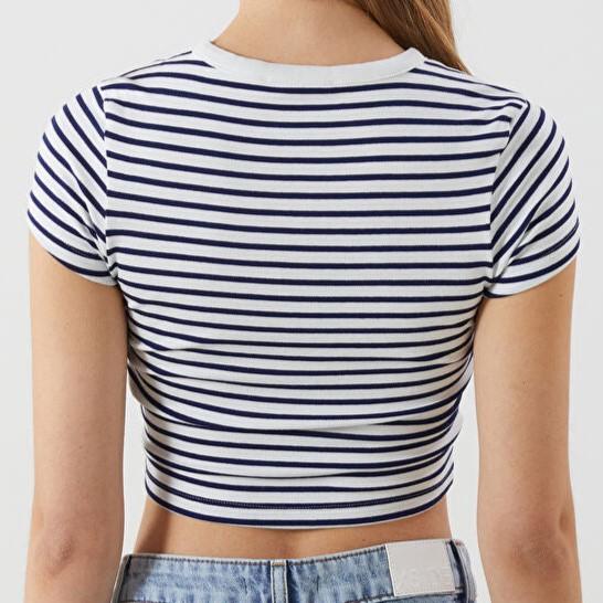 Refresh your casual rotation with this chic striped crop top, featuring a timeless navy and white nautical pattern. Designed with a soft ribbed texture and a flattering close fit, it serves as the perfect versatile piece for high-waisted styling.