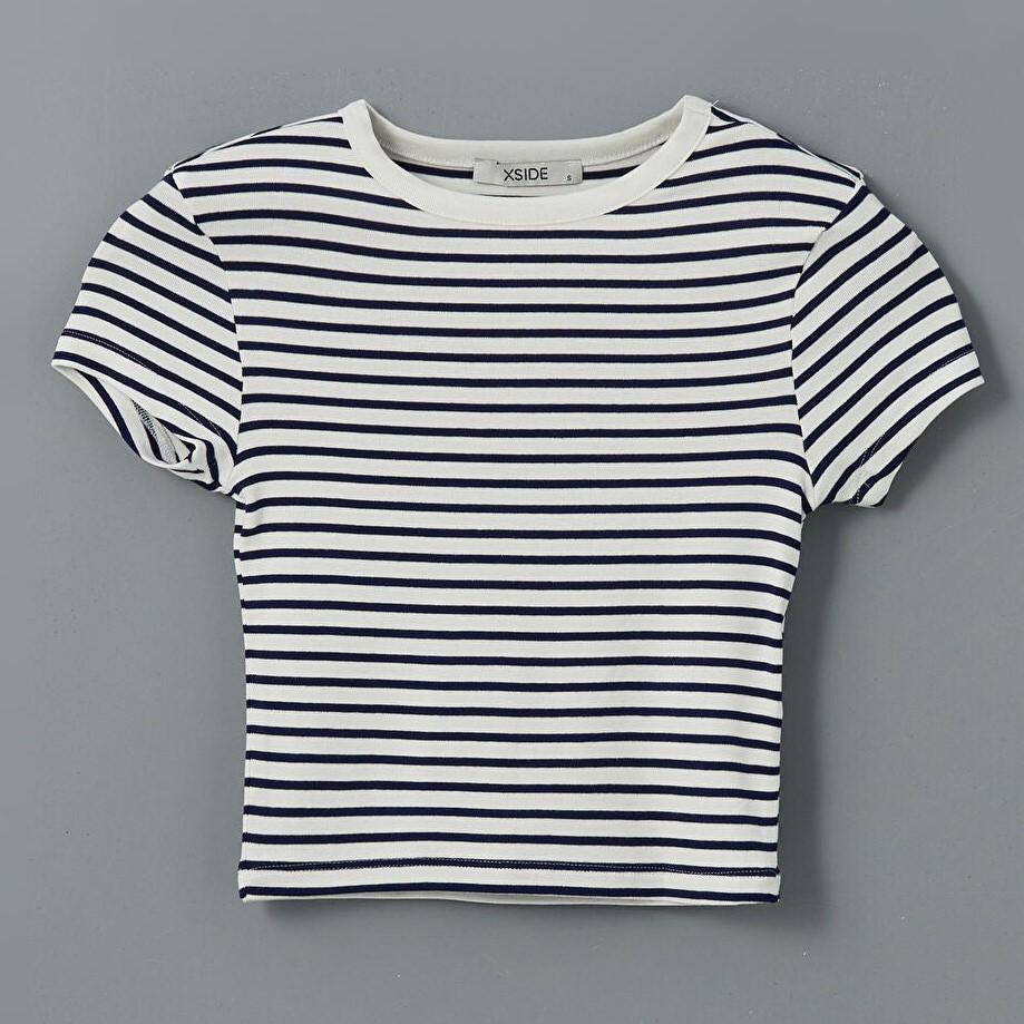 Crew Neck Striped Women's Tops - White and Navy Blue