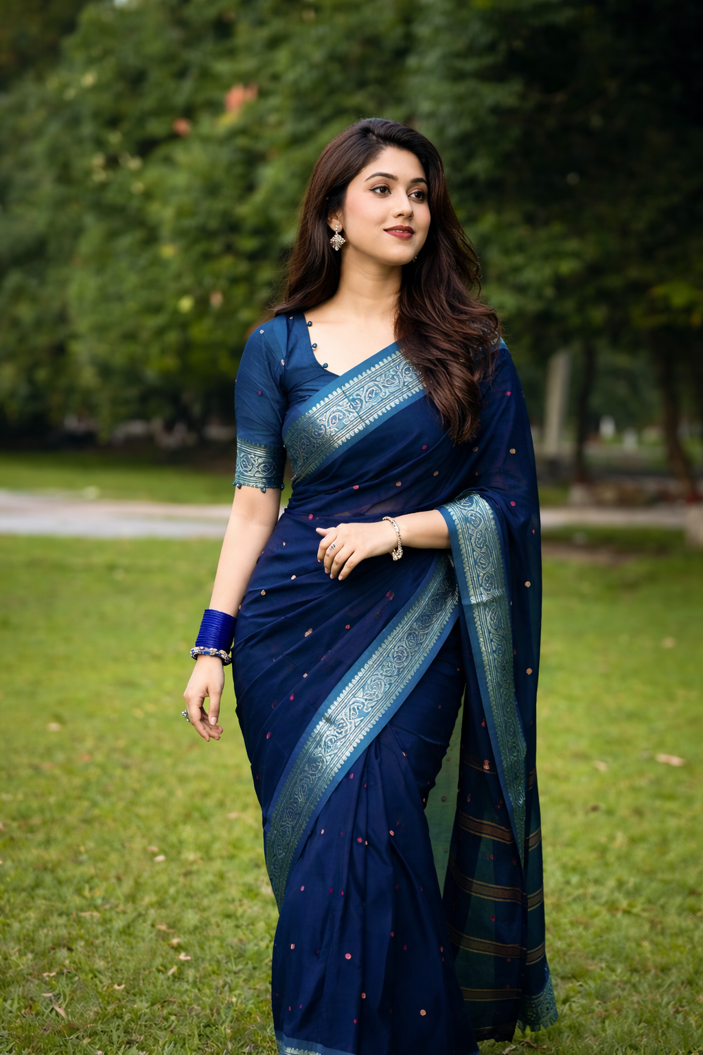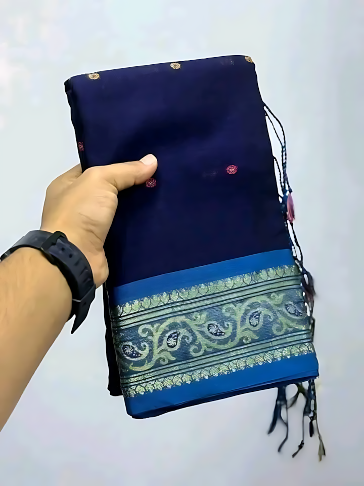 Embrace timeless elegance with this stunning blue saree highlighted by rich blue borders. The graceful contrast adds depth and sophistication, making it perfect for festive occasions and cultural celebrations. A classic statement piece for women who love traditional charm with a bold touch.