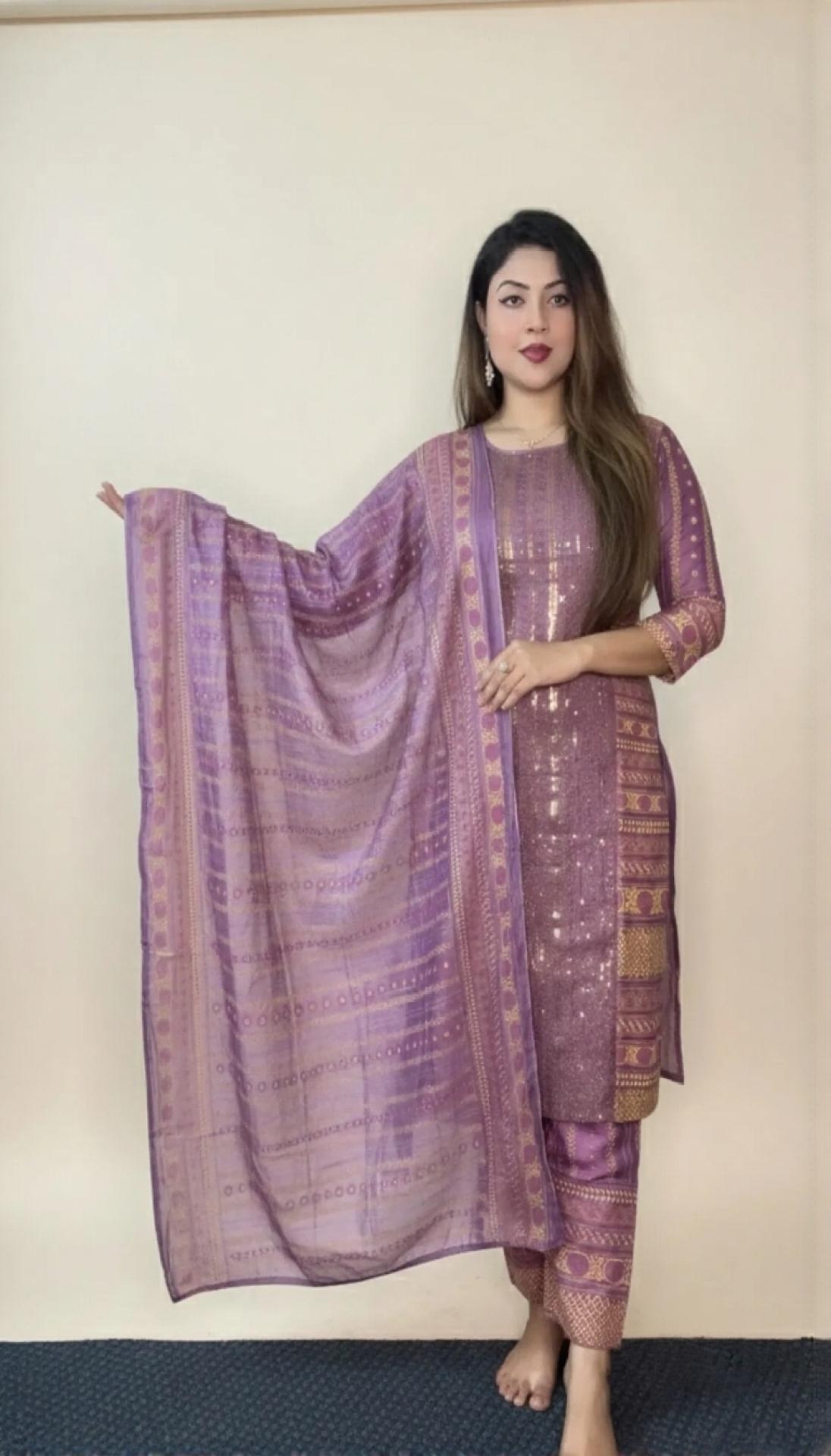 Step into elegance with this beautifully designed three-piece outfit that blends tradition with modern sophistication. The refined prints and delicate detailing create a graceful look perfect for festive occasions or stylish everyday wear. Crafted to offer both comfort and premium appeal.