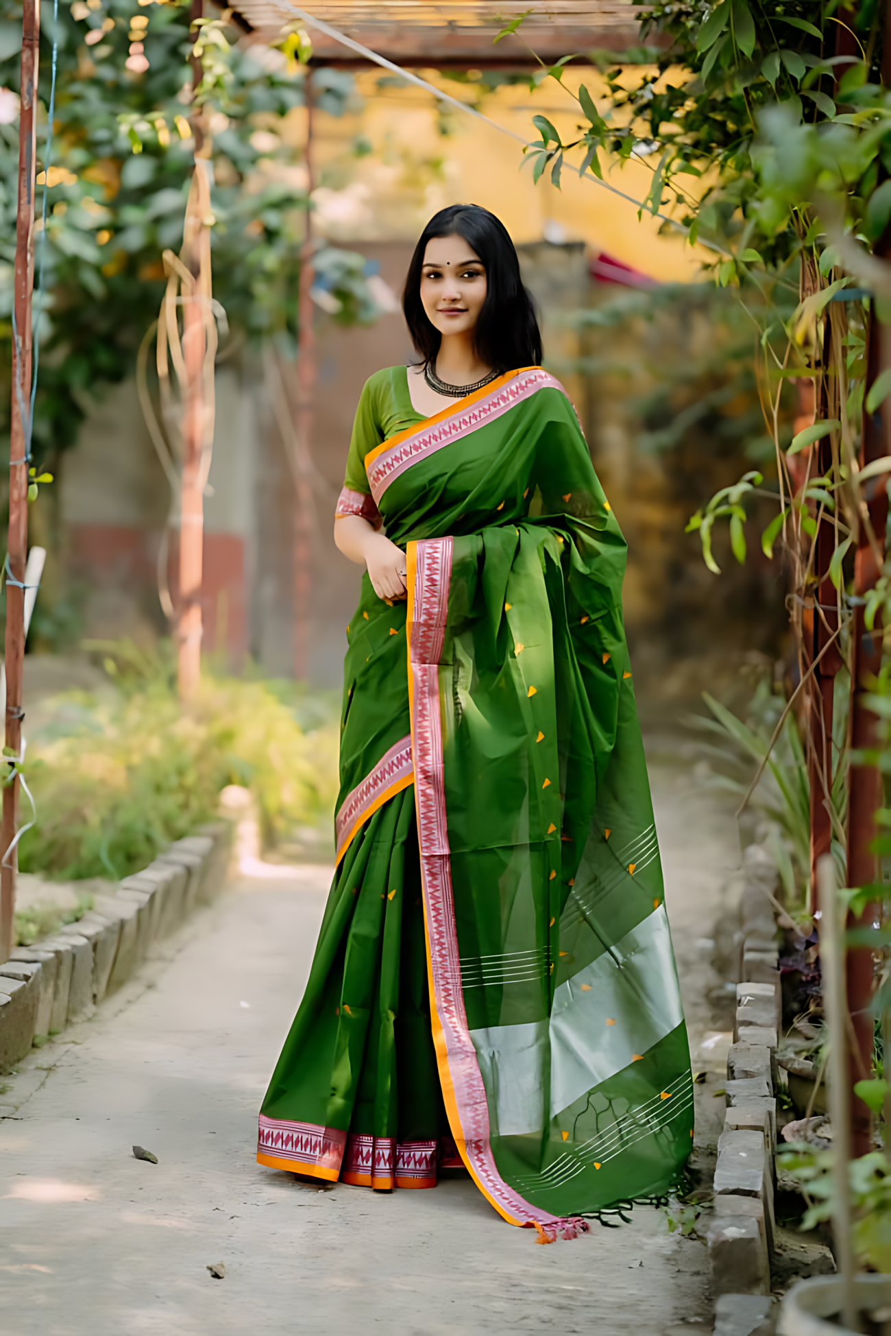 Elegant Forest Green Cotton Saree with Traditional Border