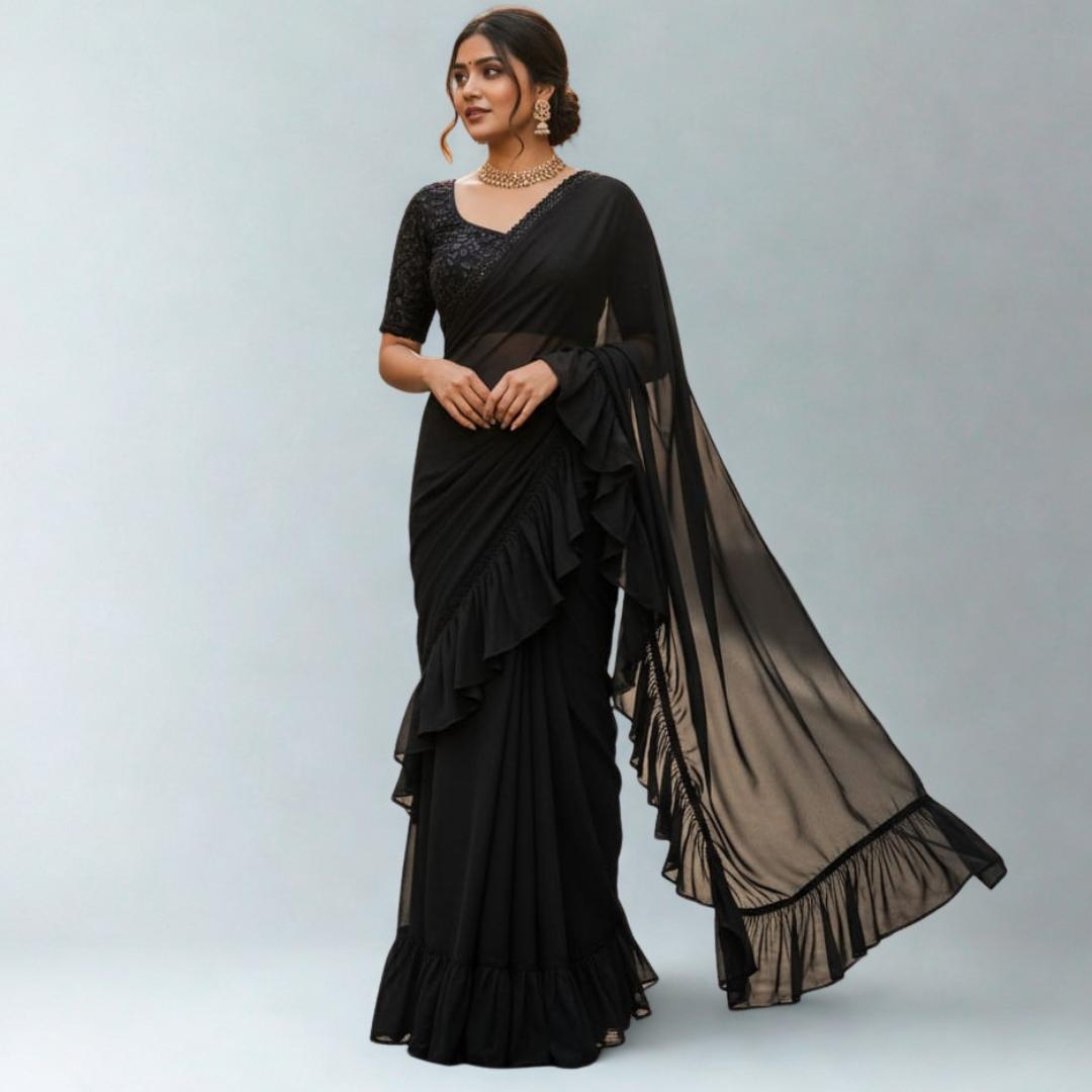 Elegant Red Ruffle Georgette Saree - Black