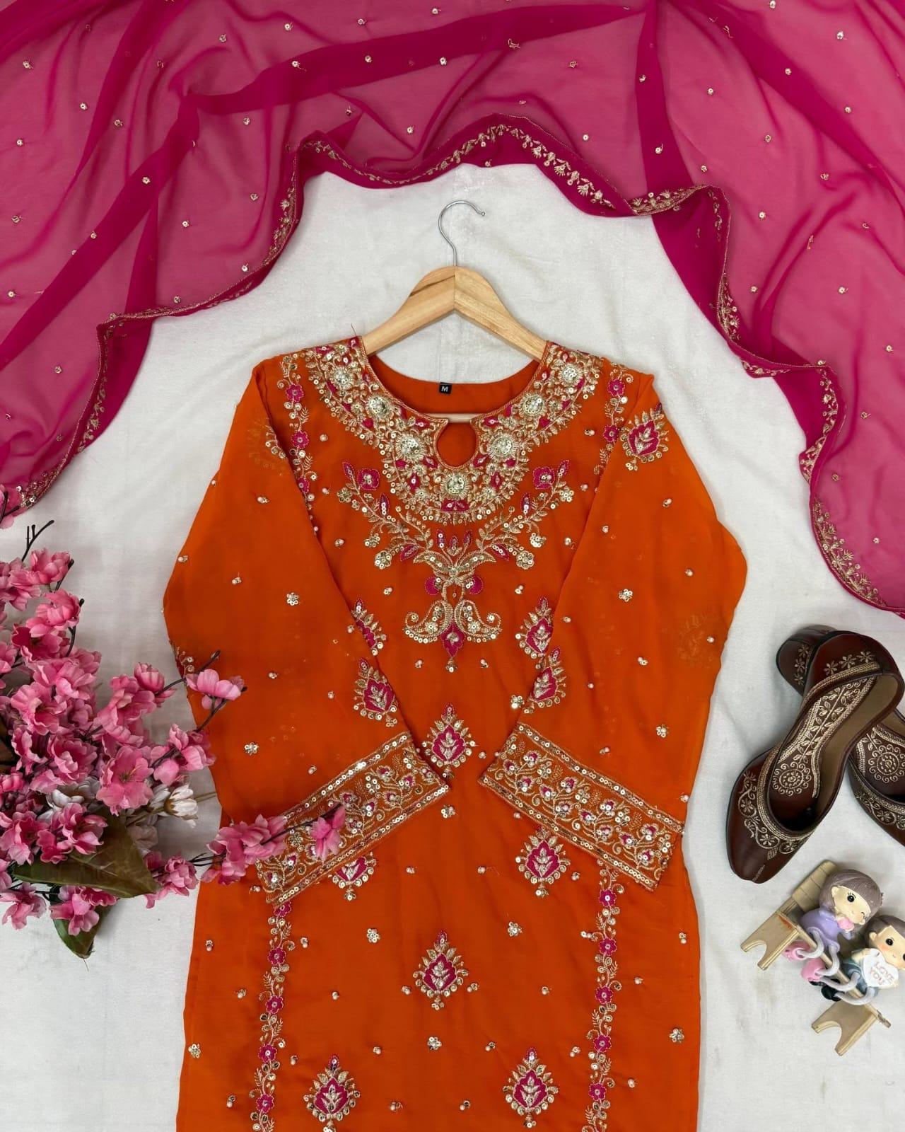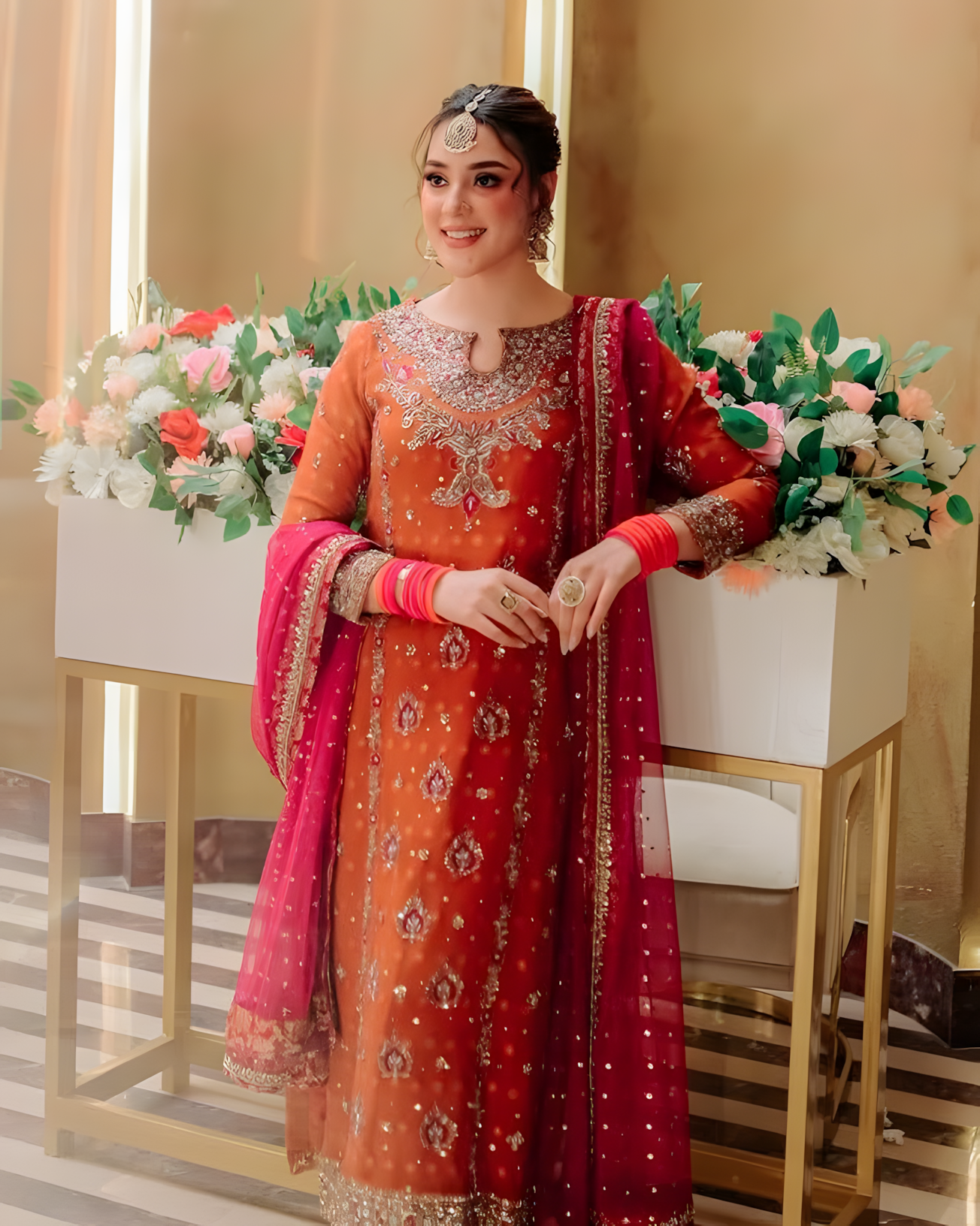 Radiate festive charm with this stunning three-piece ensemble, featuring a beautiful ombre transition from vibrant orange to deep pink. Designed for celebrations and special occasions, this set offers a luxurious look with delicate, handcrafted details.