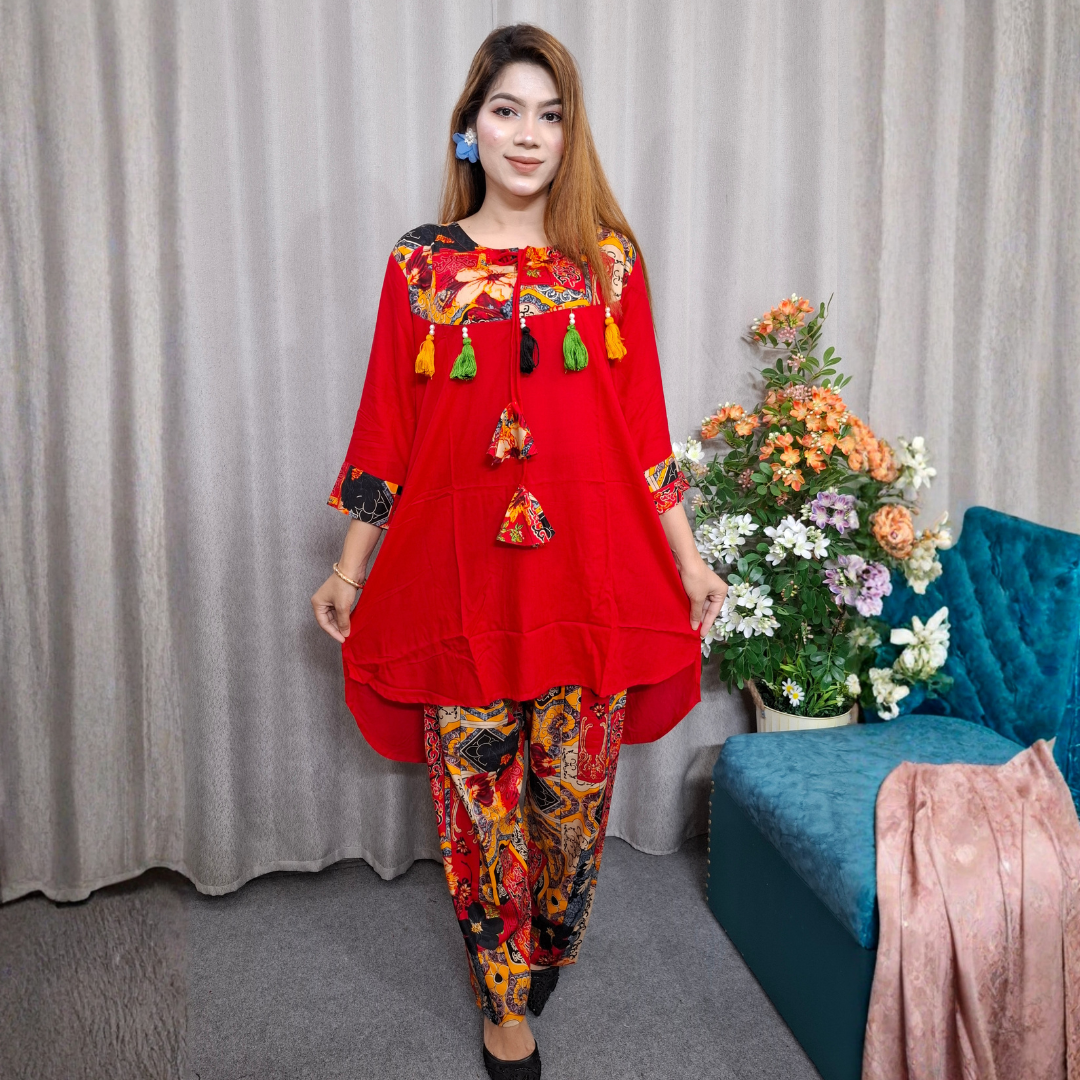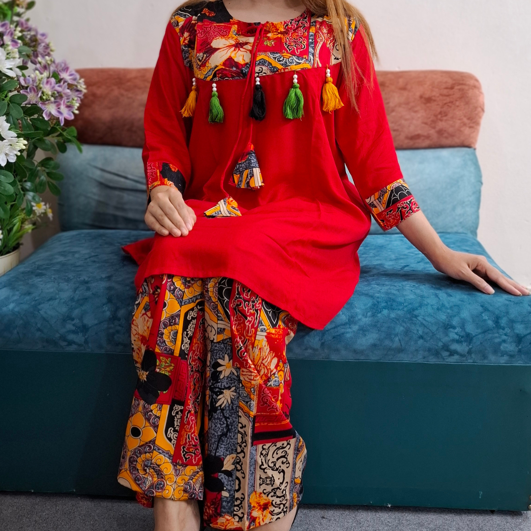 Elevate your casual ethnic wardrobe with this vibrant Tassel-Accented Two-Piece Set, a perfect fusion of traditional artistry and modern comfort. Crafted for the woman who loves a bold, artistic aesthetic, this set provides a striking and sophisticated look while maintaining an incredibly soft and comfortable feel.