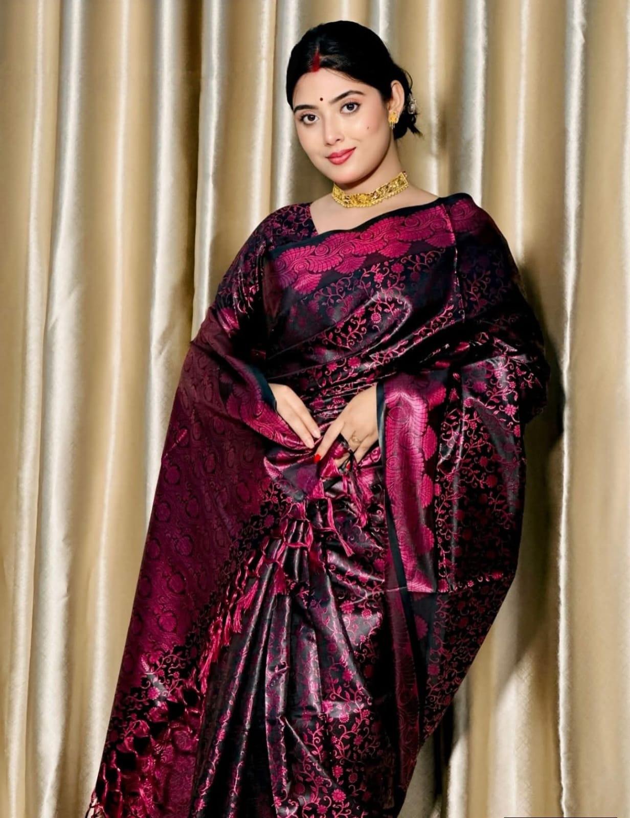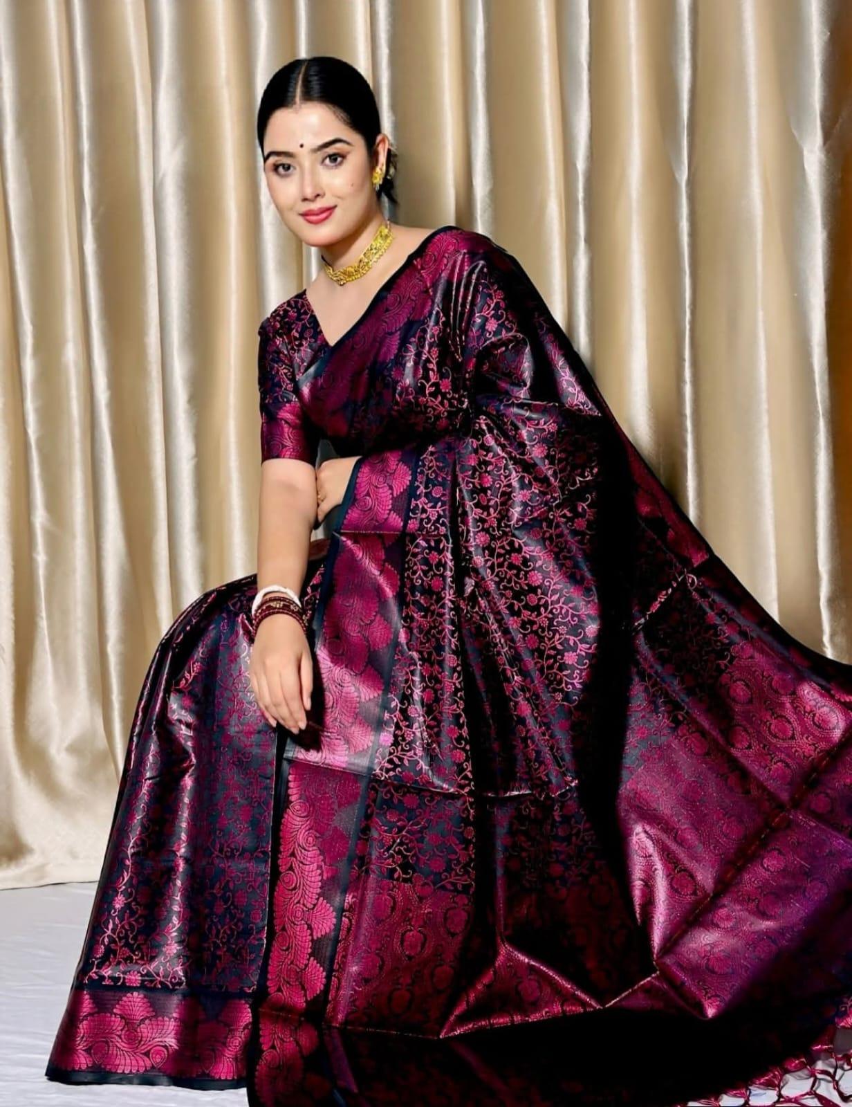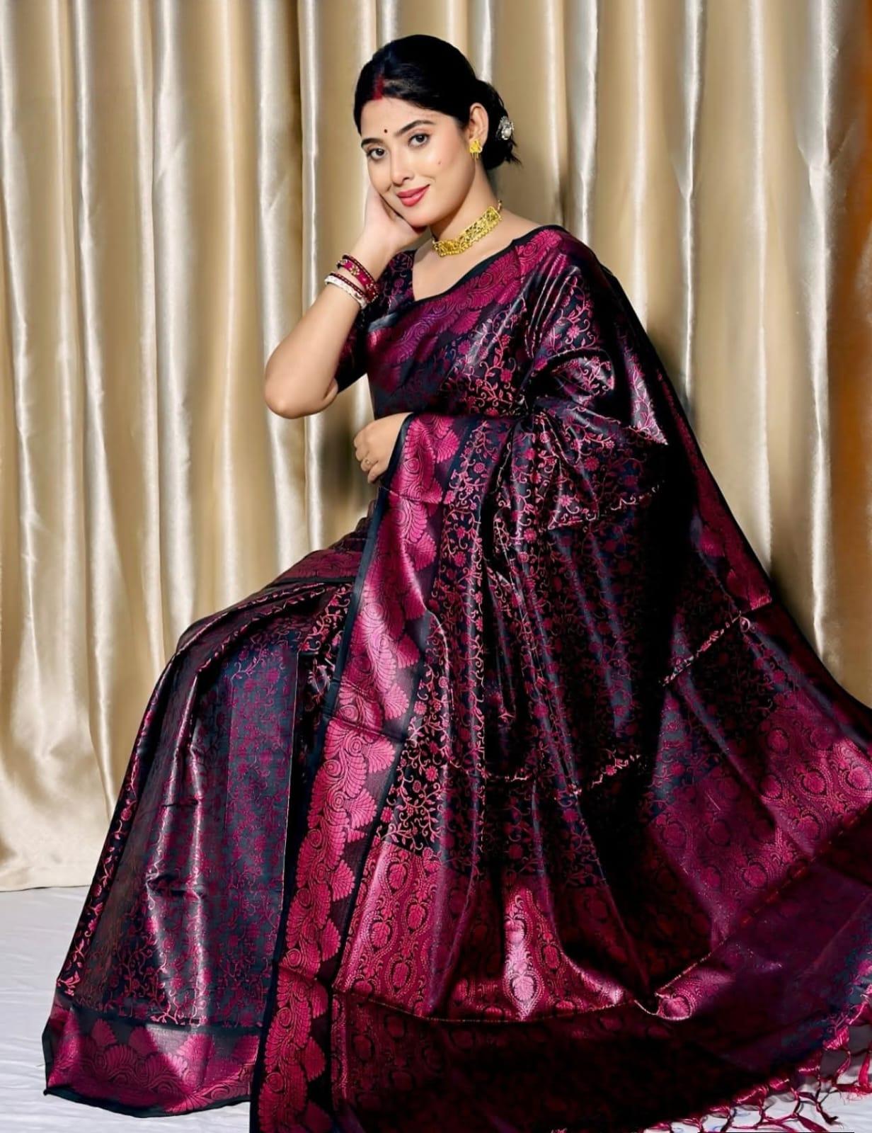 This elegant saree blends rich color with luxurious shine, creating a stunning traditional look. The intricate woven patterns add depth and sophistication, making it perfect for weddings, festivals, and special occasions. A timeless piece that reflects grace, heritage, and refined style.