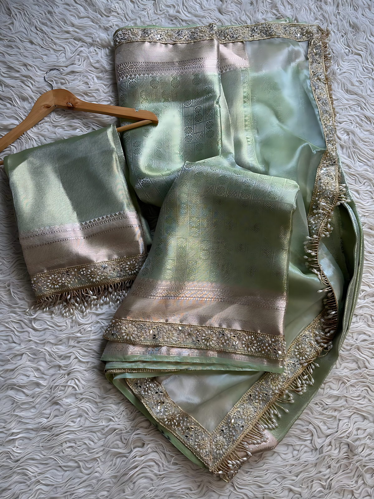This pista green bridal Kanjeevaram brocade tissue saree from Satrang Banaras features intricate designer pearl and mirror lace work, enhancing its rich texture and elegance. The detailed jhalar lace on the pallu adds a sophisticated finishing touch, making it an exquisite choice for traditional occasions. Crafted with fine craftsmanship, this saree combines heritage art with contemporary aesthetics, ensuring a graceful and regal look for the bride.