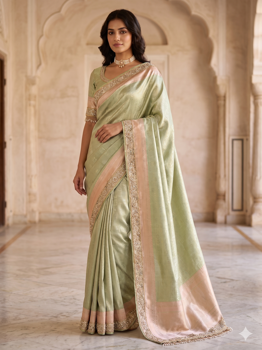 Exclusive Pastel Green Saree with Gold Tone Ornate Border