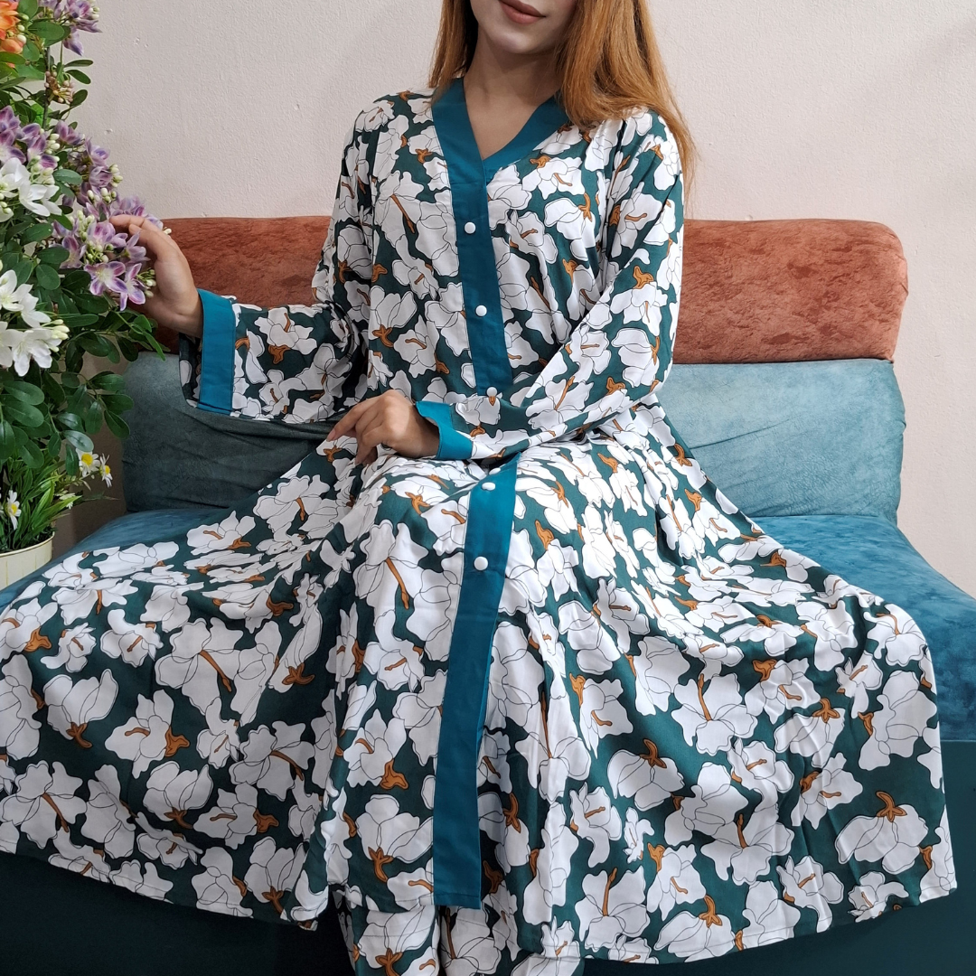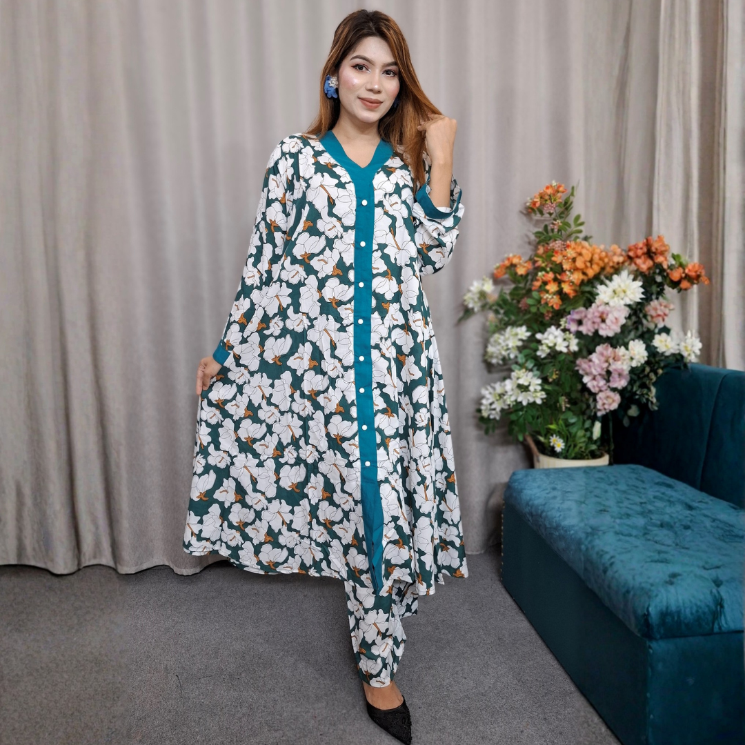 Contrast Teal Panel: Detailed with a solid teal green panel along the button line and collar, providing a powerful visual frame to the floral design.