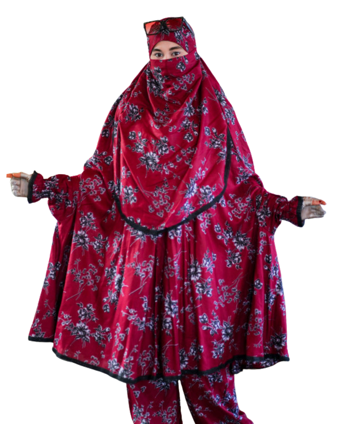 Floral Printed Soft Linen Khimar Set - Maroon & Silver