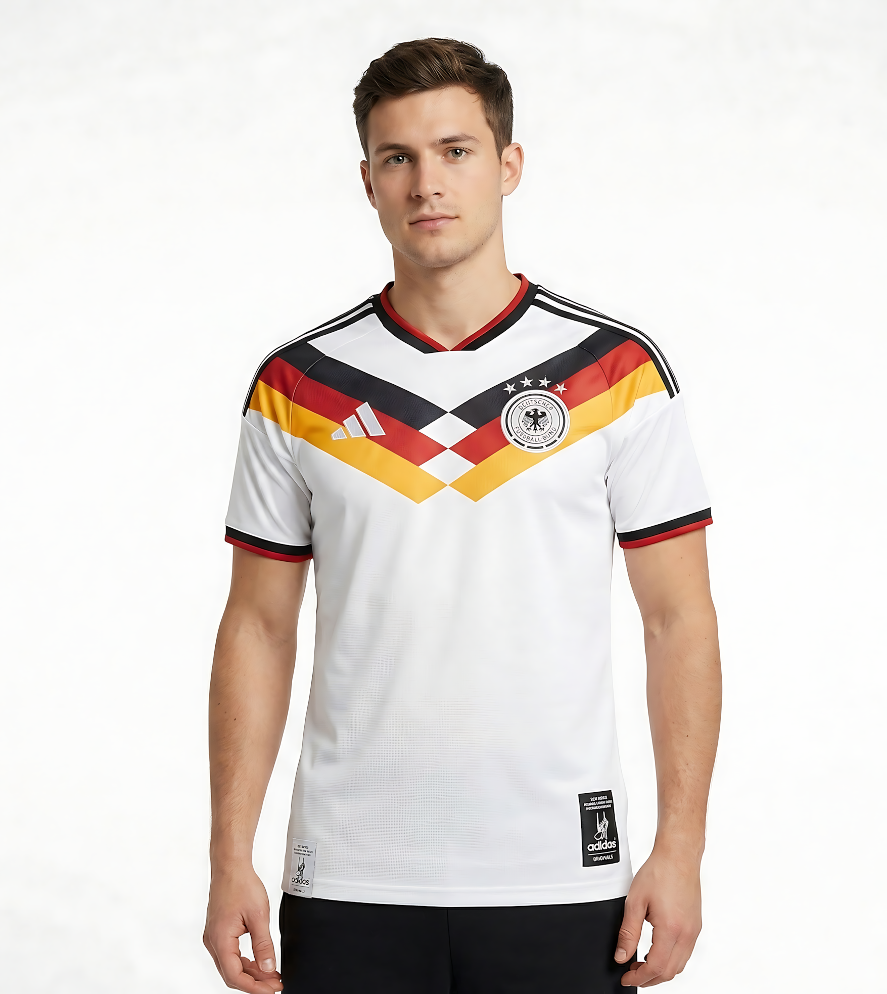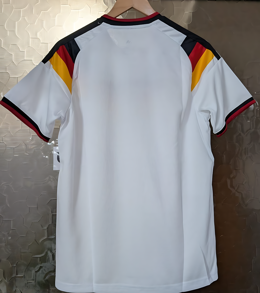 Show your support in style with this Germany Home Jersey, designed for fans who value both tradition and performance. Featuring a clean white base with bold black, red, and yellow chevron detailing across the chest, this jersey captures the spirit and heritage of German football with a modern twist.