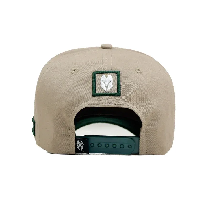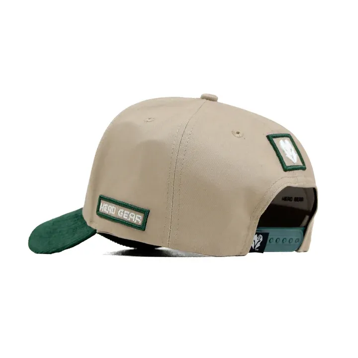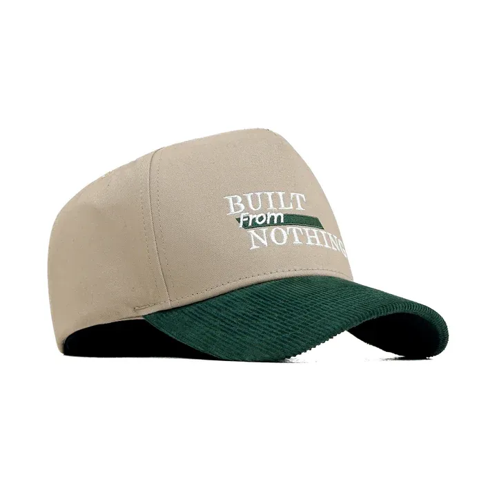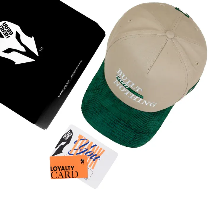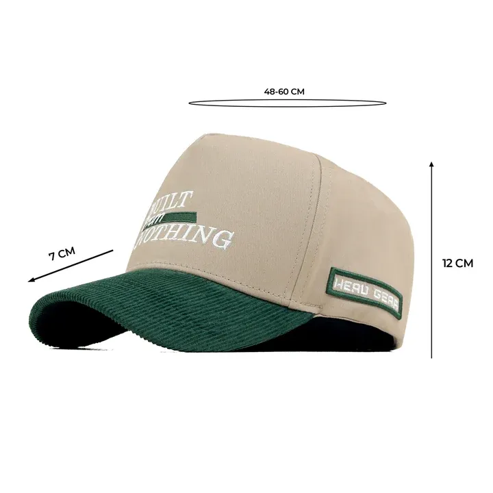 Introducing the Head Gear Built From Nothing Cap – a tribute to hustle, grit, and the power of starting small. This statement piece features a barley-toned crown in durable twill fabric, paired with a green corduroy visor that adds rich texture and contrast. At the front, “BUILT FROM NOTHING” is boldly embroidered in green, echoing the cap’s fearless attitude. Designed with a high crown 5-panel structure, it delivers a sharp silhouette and elevated streetwear edge. The adjustable snapback at the back ensures a secure and flexible fit.