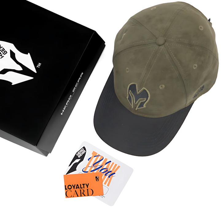 The crown is made from deep green suede, offering a soft, premium texture with a refined matte finish. Paired with a black twill visor, the cap delivers strong contrast and lasting durability. On the front, the Head Gear logo is embroidered in black thread, maintaining the sleek and understated aesthetic. With a structured 6-panel build, it offers a sharp, tailored silhouette, while the adjustable buckle strap at the back provides a secure and custom fit.