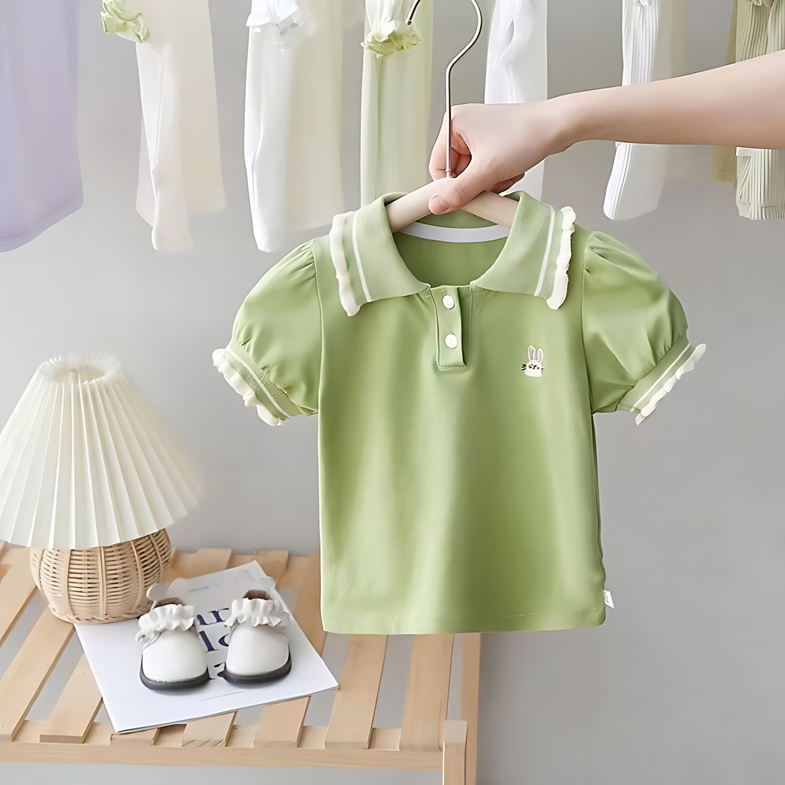 Give your little one a sweet and stylish look with this adorable soft olive top, designed with delicate frill details and a charming collar. Perfect for everyday comfort and special outings, it blends simplicity with elegance beautifully.