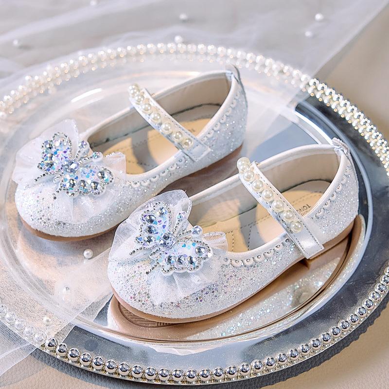 These enchanting Mary Jane style flats are designed to add a magical touch to any festive occasion. Combining a radiant glitter finish with delicate pearl and crystal butterfly accents, they provide a secure and comfortable fit while ensuring your little one feels like the belle of the ball.