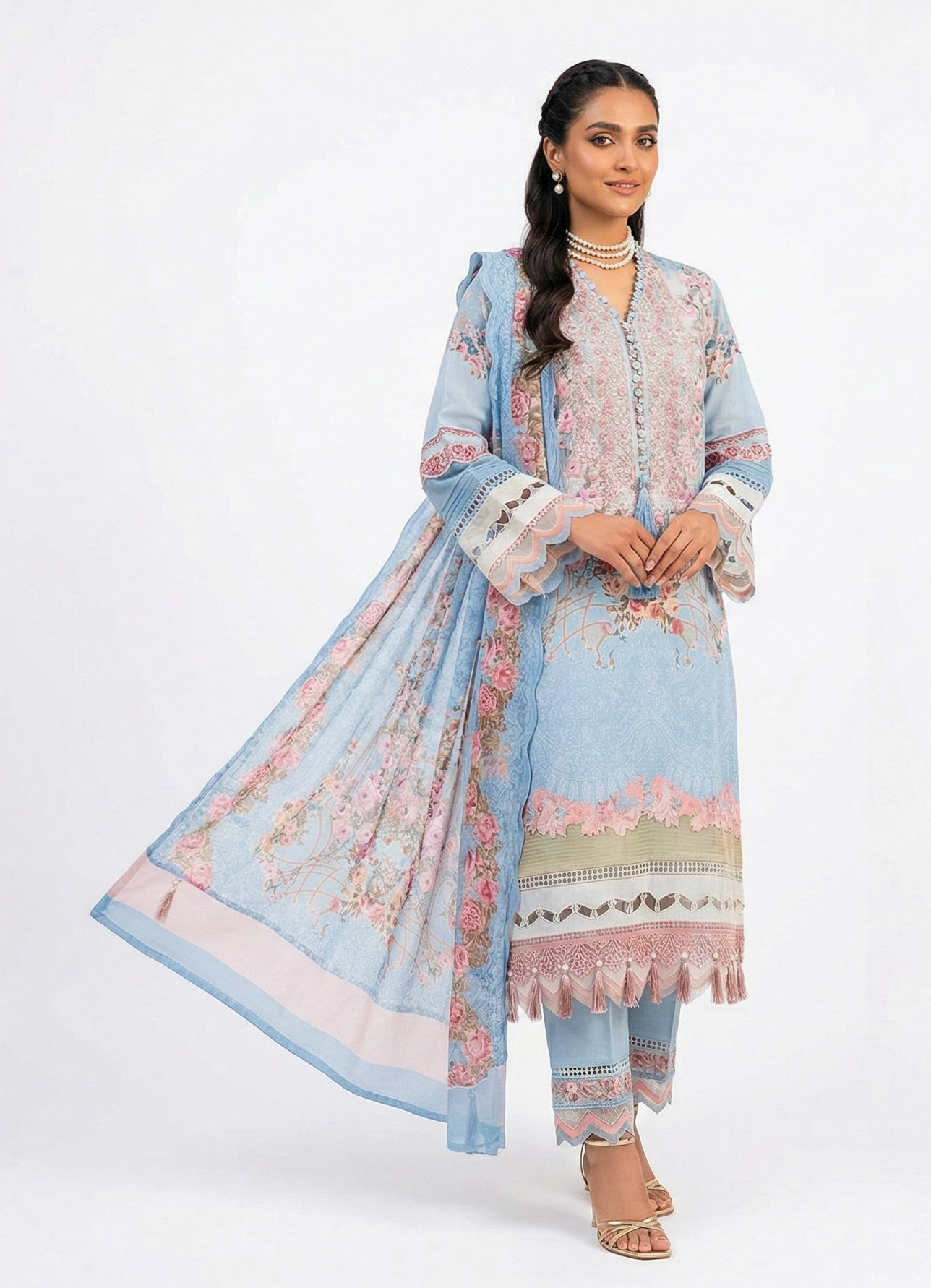 Elevate your elegance with this beautifully designed three-piece outfit that blends soft colors with intricate detailing. The delicate floral patterns and graceful silhouette create a refined and feminine look. Perfect for festive gatherings, special occasions, or stylish everyday wear.