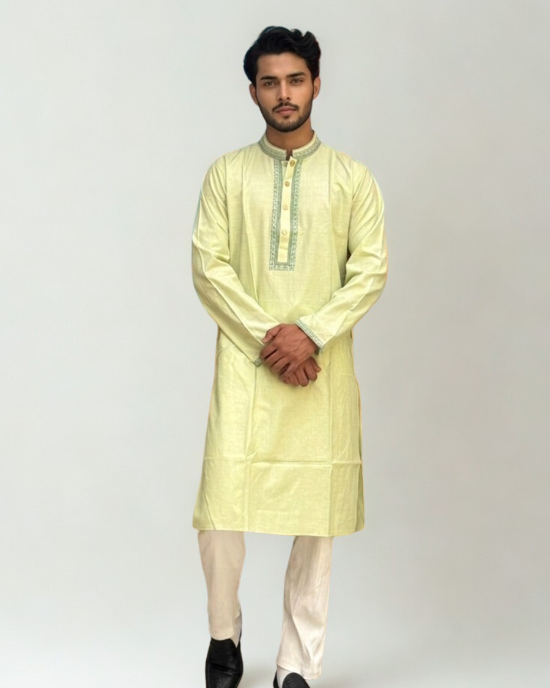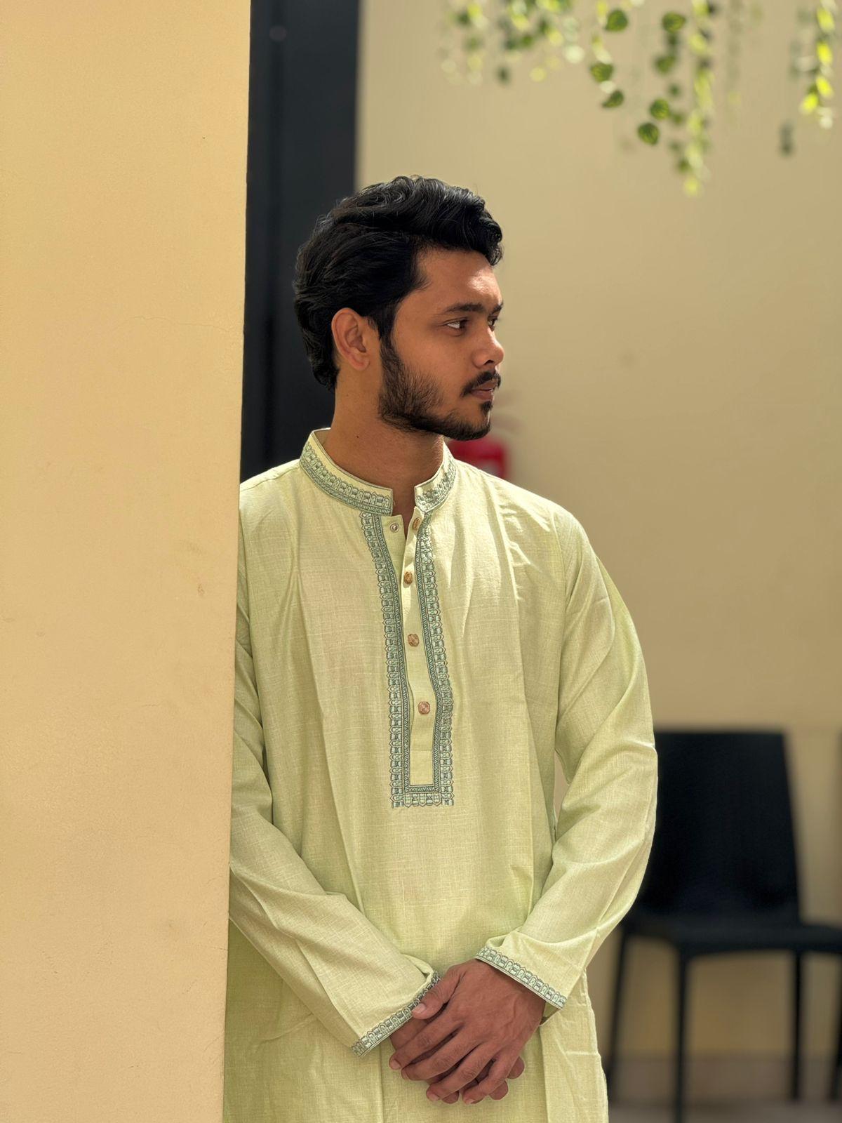 Command any room with aristocratic grace in this Men Lime Green Cotton Embroidered Panjabi, a classy masterpiece designed for the man who values a neat and powerful traditional silhouette. This garment blends heritage craftsmanship with a modern, attractive aesthetic perfect for formal occasions.