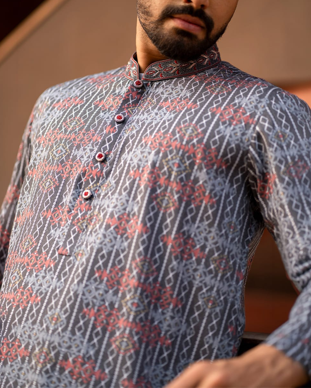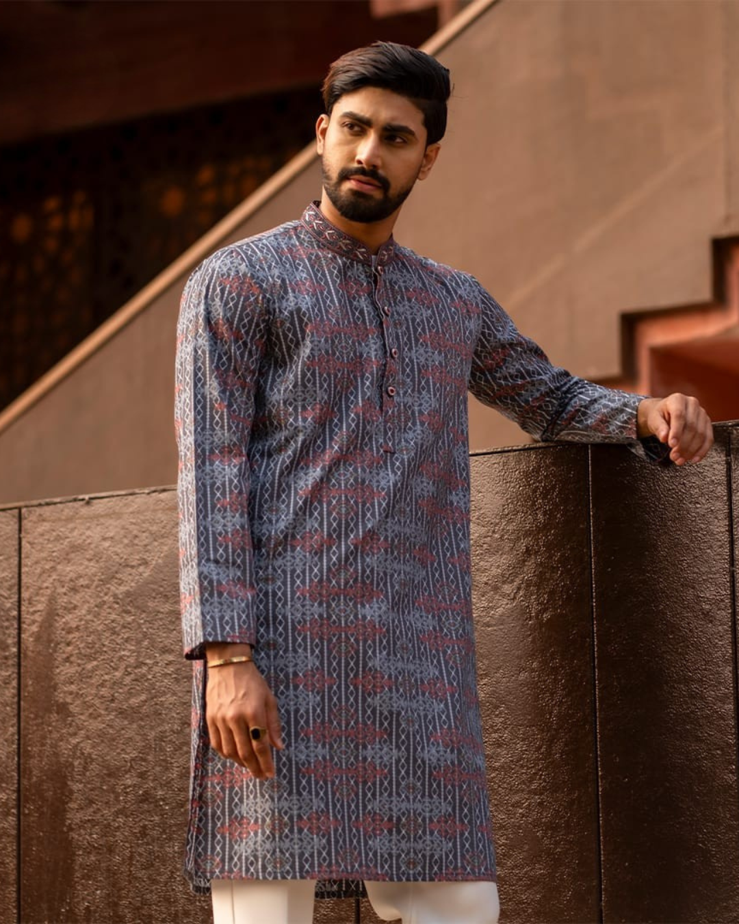 Make a distinctive impression with this stylish patterned Panjabi, perfect for formal occasions and cultural celebrations. This piece offers a contemporary design aesthetic, blending traditional craftsmanship with a sharp, modern look.