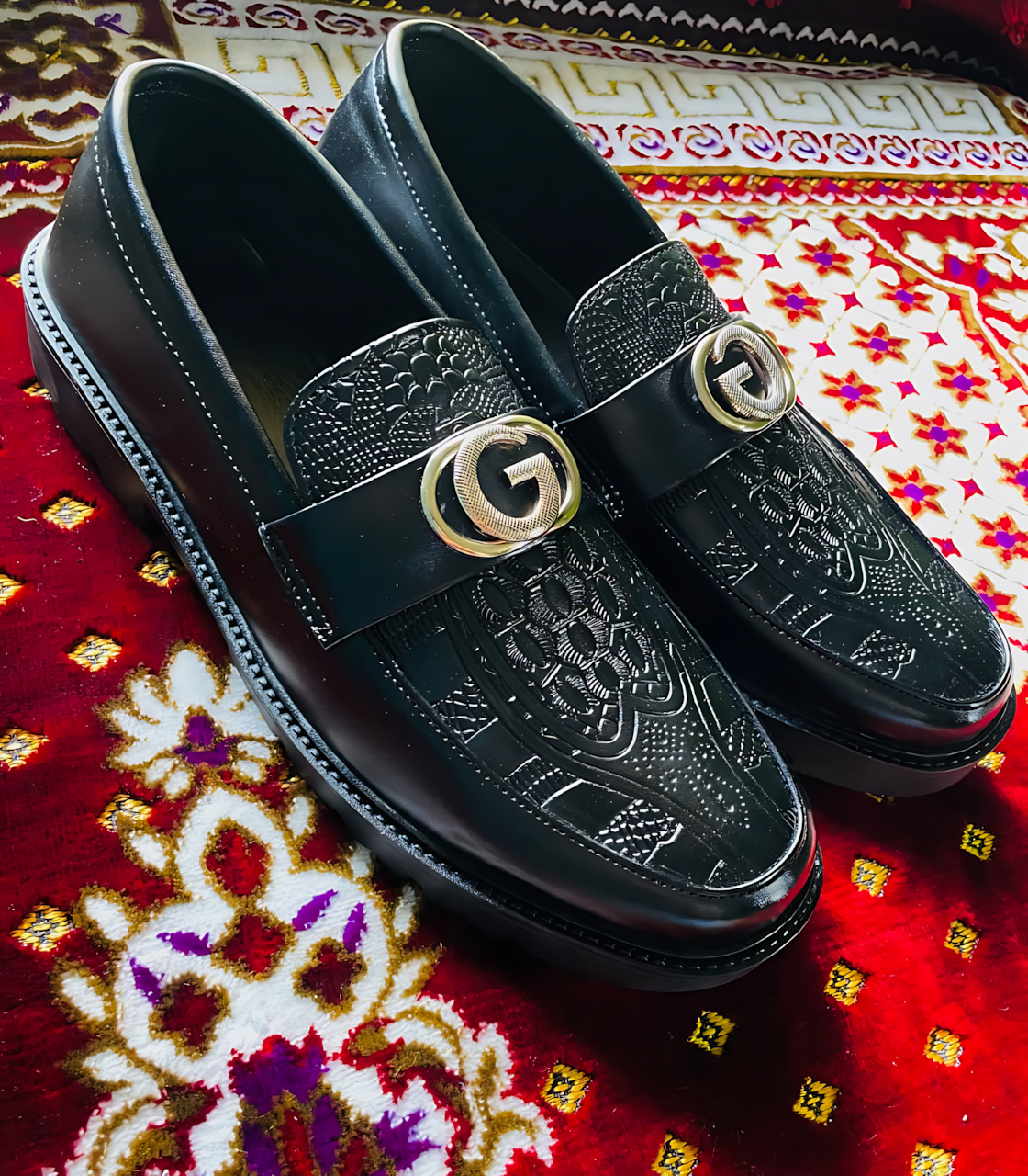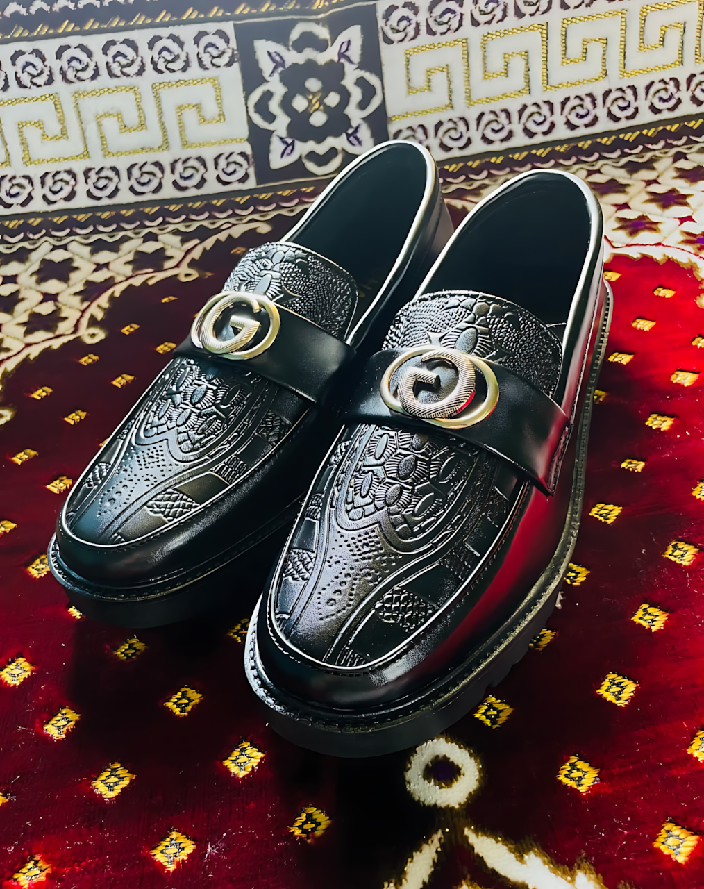 Step up your style with these premium chunky loafers, designed for both elegance and comfort. Crafted from high-quality black leather, these shoes feature an eye-catching embossed pattern on the upper, giving them a bold and sophisticated look. The classic horsebit metal detail adds a touch of luxury, making them perfect for formal and smart-casual outfits.