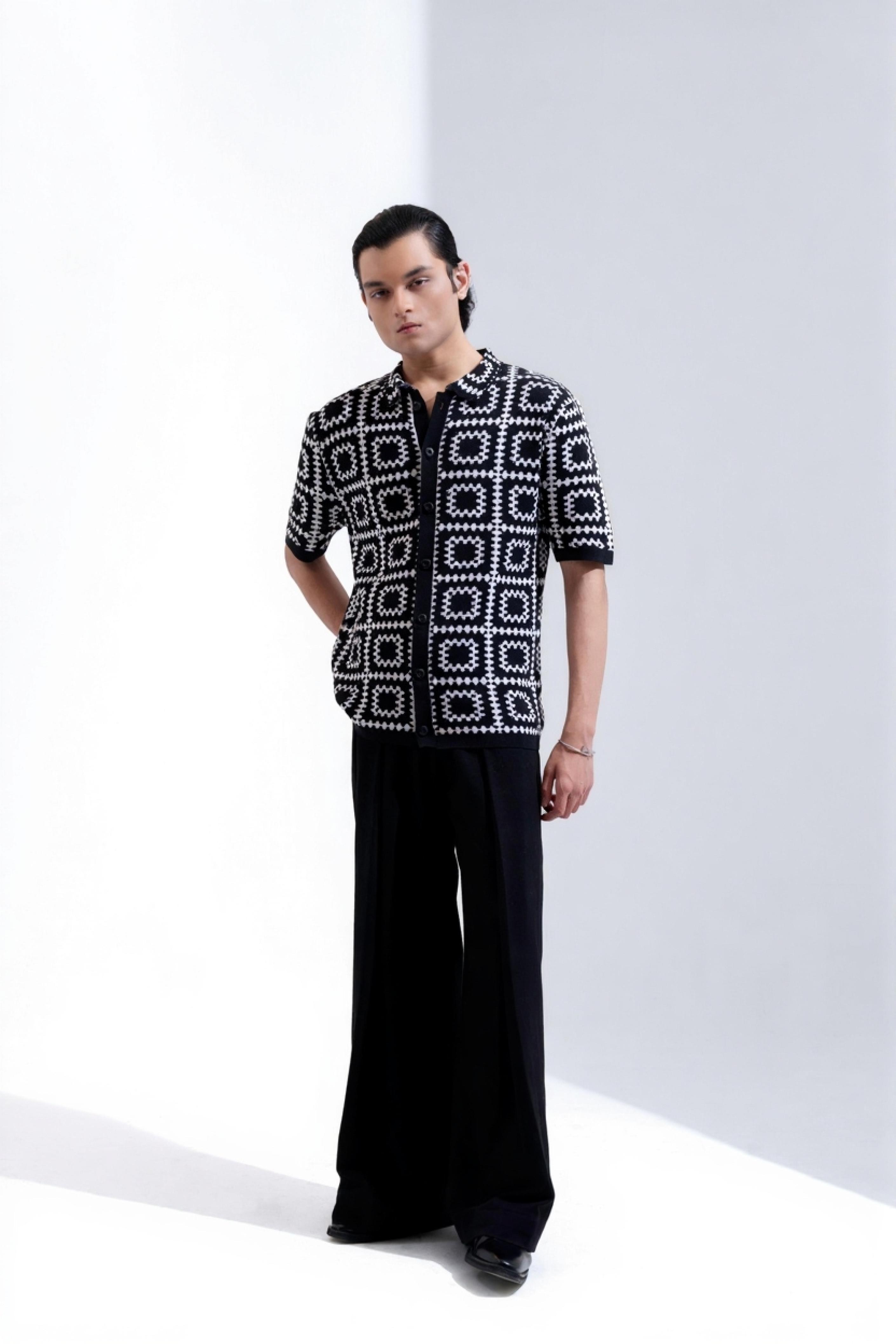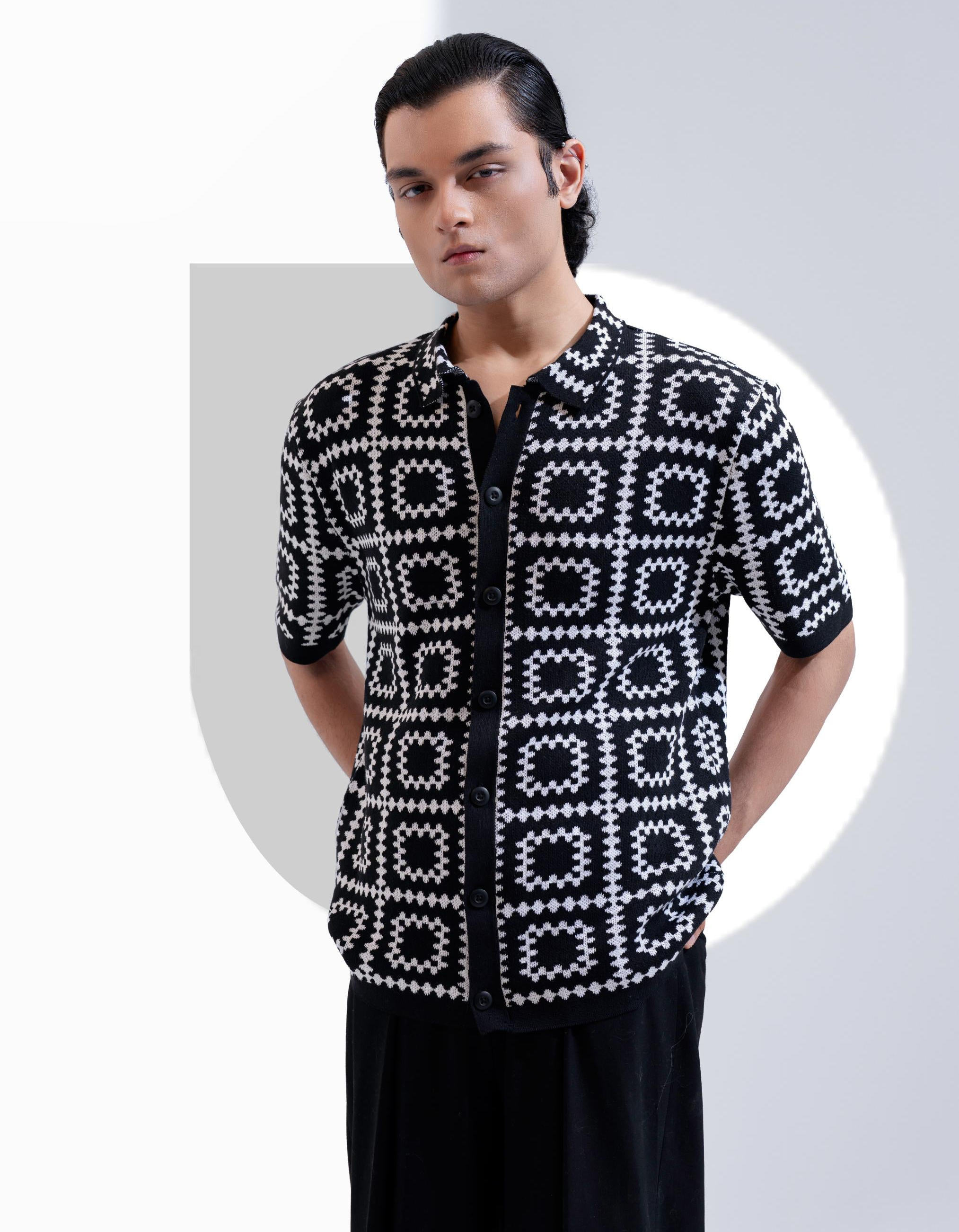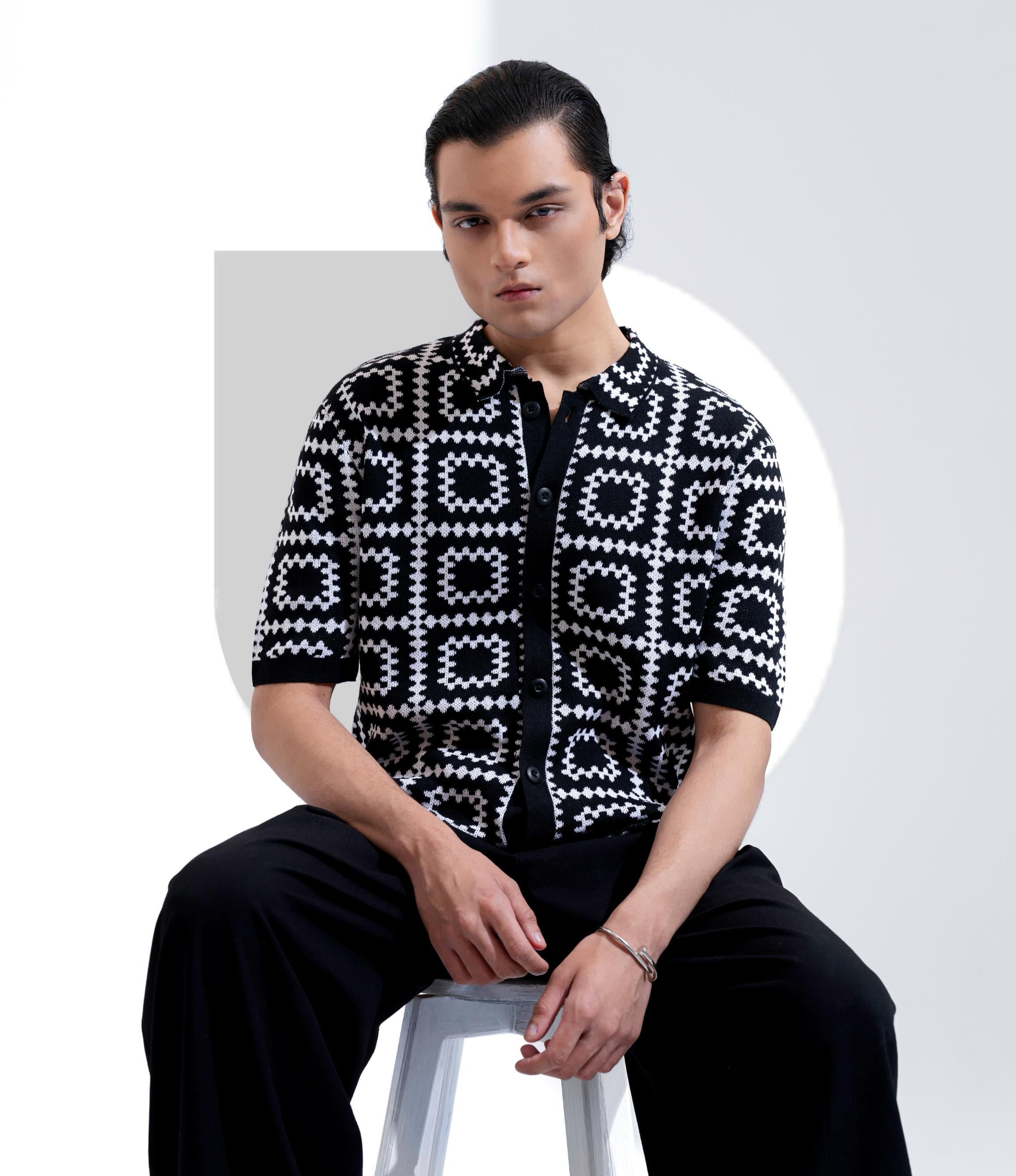 Introduce modern texture and graphic style to your wardrobe with the Men’s Black & White Geometric Knit Shirt. Designed with a bold repeating pattern and crafted from breathable knit fabric, this piece delivers contemporary sophistication with effortless comfort.