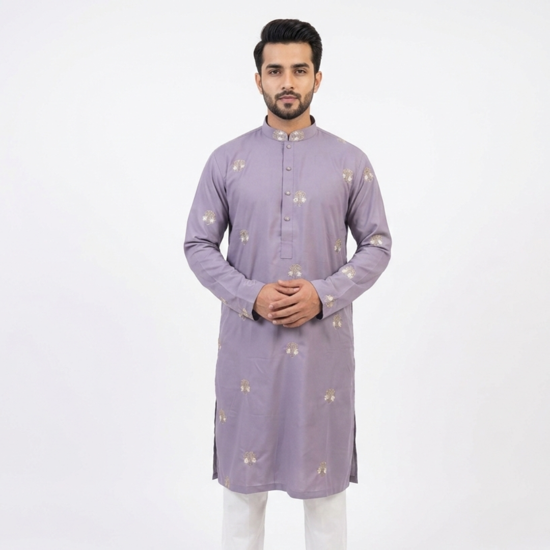 Elevate your traditional attire with this sophisticated Designer Panjabi in a versatile slate grey. Combining intricate artisan details with a modern, clean silhouette, this piece is designed for a premium look that transitions effortlessly from daytime prayers to evening festivities.
