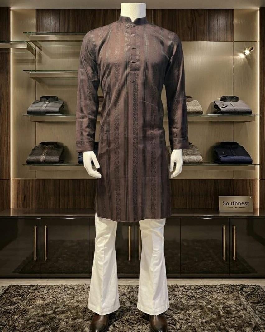 Refine your traditional attire with this sophisticated Designer Panjabi in a deep chocolate brown. Featuring a blend of classic embroidery and modern geometric textures, this piece is designed for a rich, masculine aesthetic perfect for evening festivities.