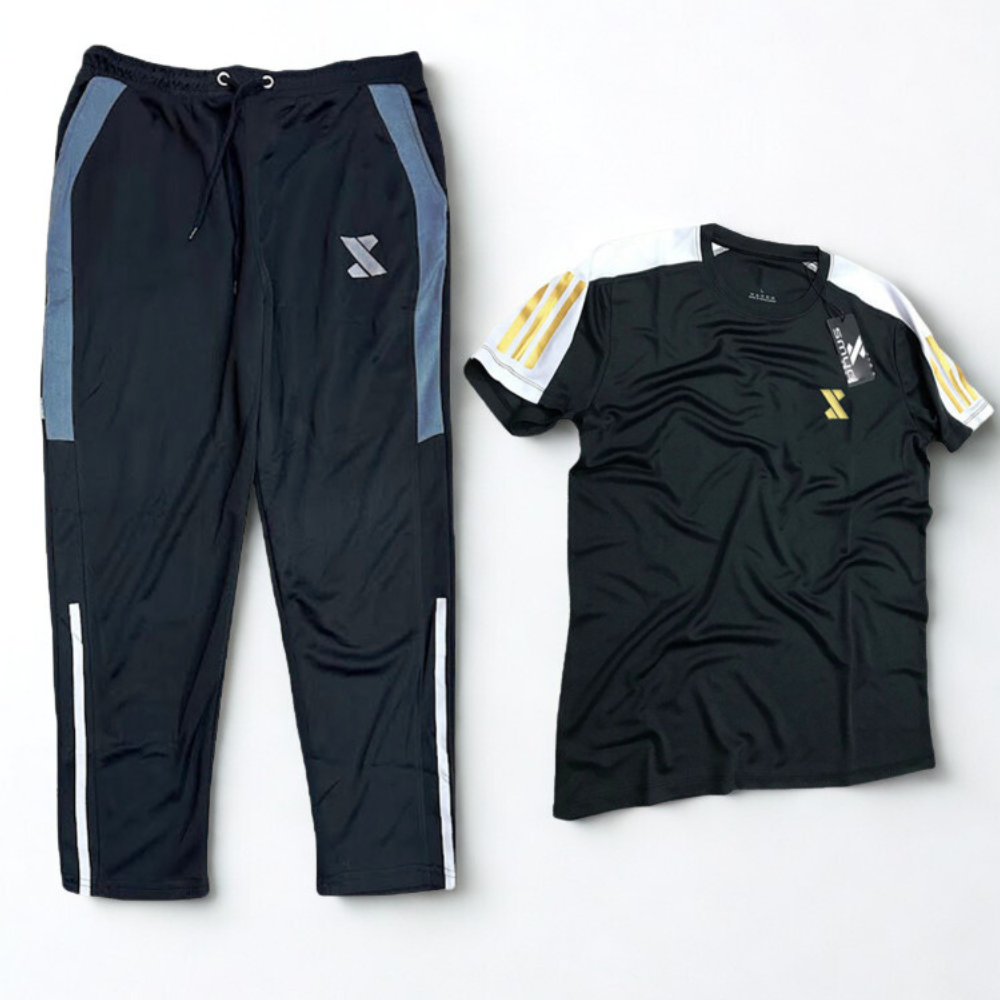 Step up your athletic game with this premium two-piece coordinated set, featuring a sharp Charcoal Black T-shirt and matching paneled joggers. Designed for those who demand both style and substance, this set utilizes specialized technical fabrics to keep you cool, comfortable, and visually striking during any season.