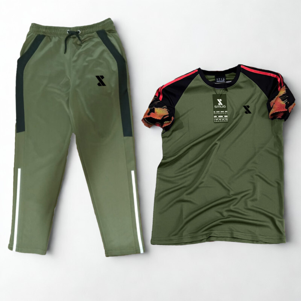 Elevate your training or casual routine with this high-performance two-piece set, featuring a tactical Olive Green T-shirt and matching athletic trousers. This set is engineered using specialized fabrics to ensure you stay cool, comfortable, and sharp-looking regardless of the season.