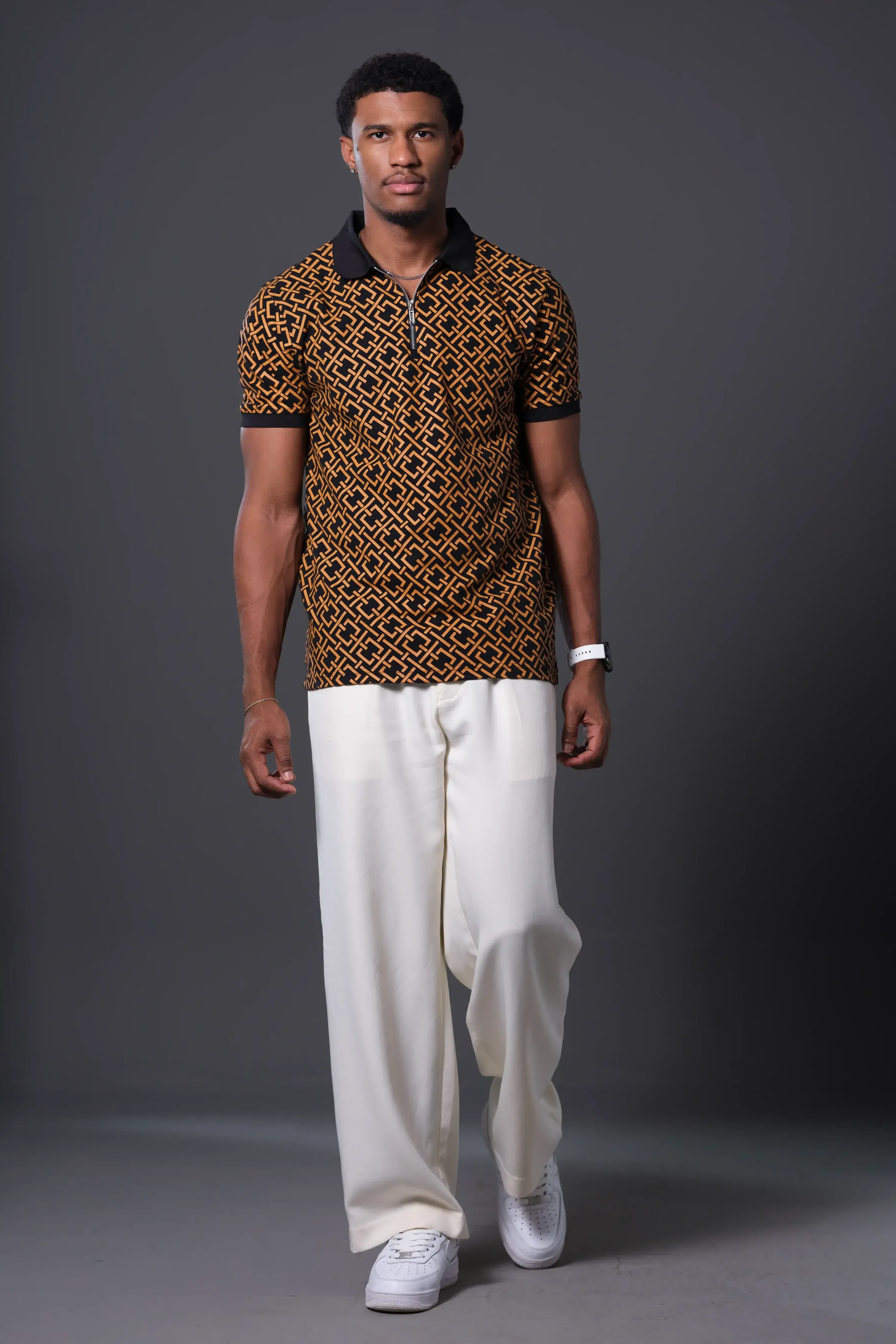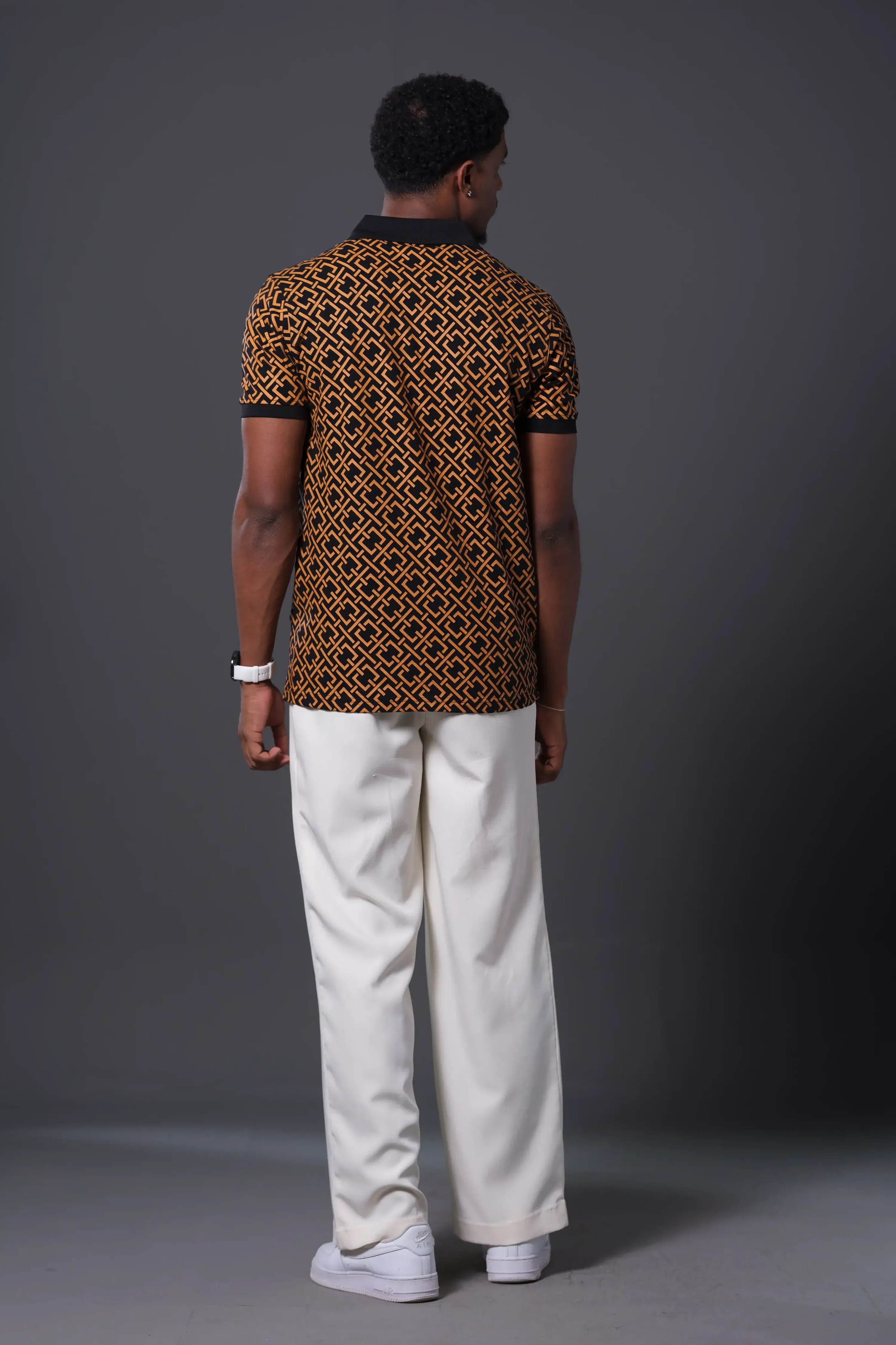 A bold statement in contemporary fashion, the All-Over Print (AoP) Polo combines luxury with everyday wearability. Designed for those who appreciate intricate patterns and standout style, this polo features a striking black and amber geometric print, perfectly balanced with a solid black collar and cuffs for a refined touch.