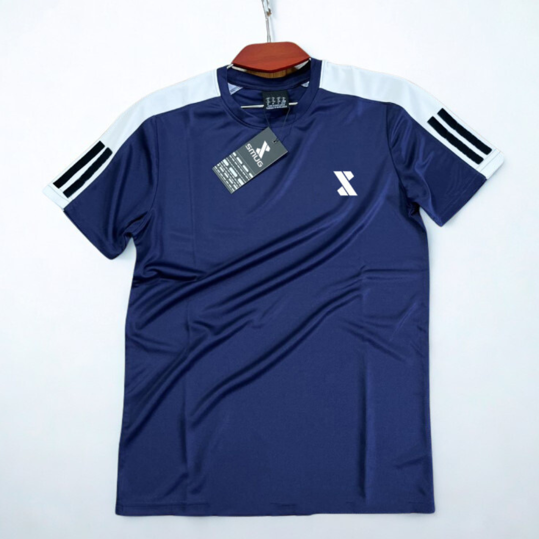 Sporty Design Details: This set includes two versatile t-shirts—one in a rich navy blue and one in a sleek charcoal grey—each featuring stylish sleeve-stripe detailing and a subtle brand logo.