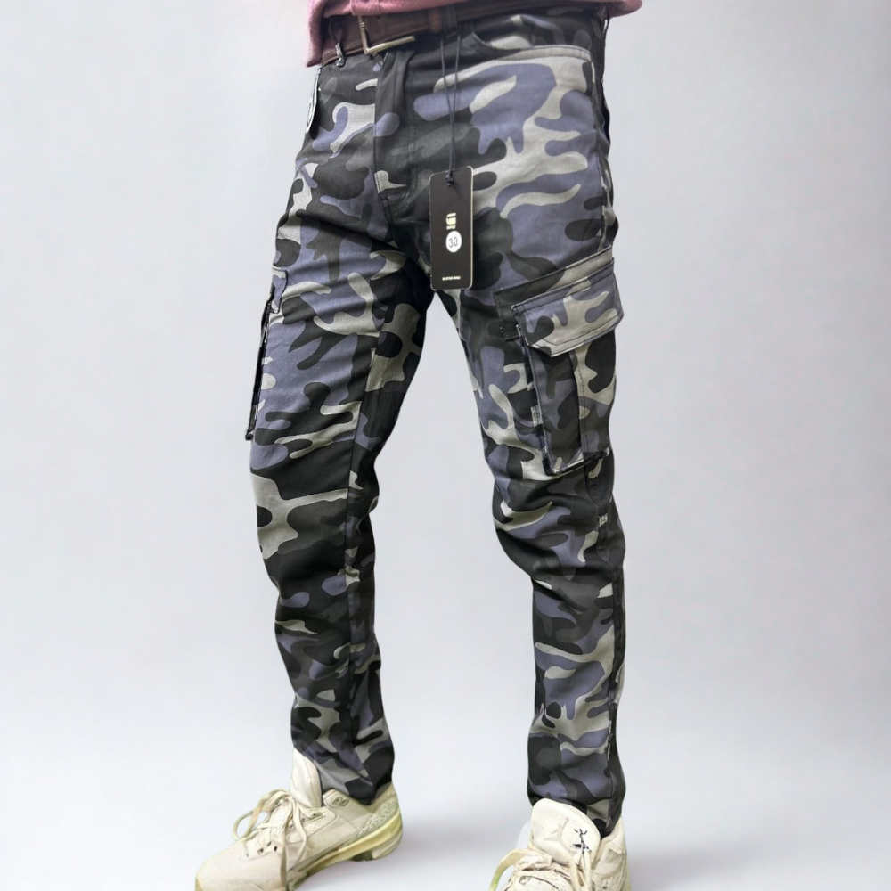 Add a sleek, modern edge to your utility wardrobe with these gray and black camo cargo pants. Crafted from heavy-duty gabardine, these pants are built for a rugged lifestyle while maintaining a sharp, export-quality look.