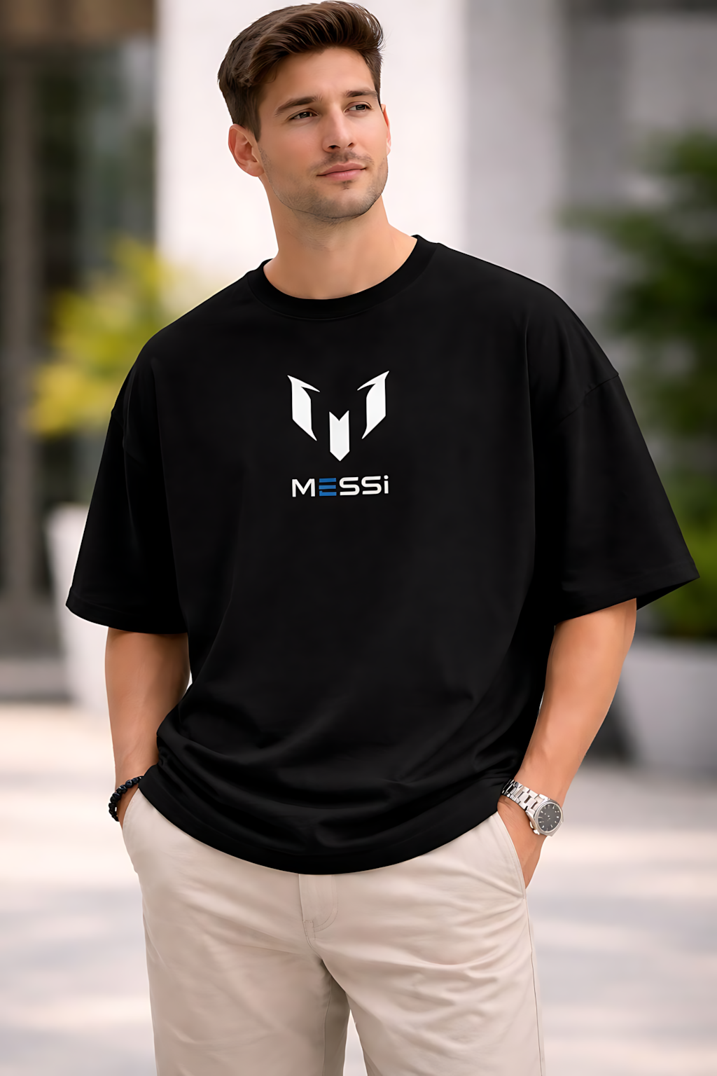 Upgrade your style with this Messi Logo Black Drop Shoulder T-Shirt. Made from premium cotton fabric, this oversized streetwear tee ensures all-day comfort and trendy look. Perfect for football lovers, Messi fans, casual wear & daily fashion. The high-quality print stays long-lasting without fading. Ideal for summer wear, outings, and stylish everyday use.