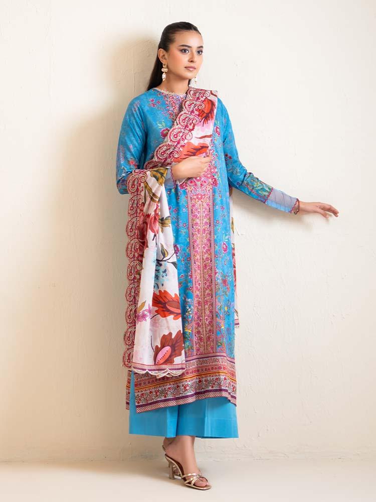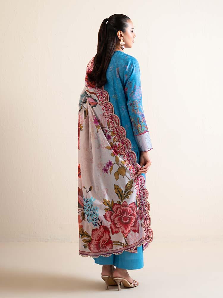 Add a splash of color to your wardrobe with this vibrant 3-piece suit Featuring a stunning Cerulean Blue base, this ensemble is beautifully contrasted with rich crimson and earthy floral prints. The digital printed lawn shirt is adorned with an intricate embroidered neckline, while the contrasting white and red dupatta features exquisite cut-work embroidery, making it a perfect choice for festive gatherings or elegant daytime wear.