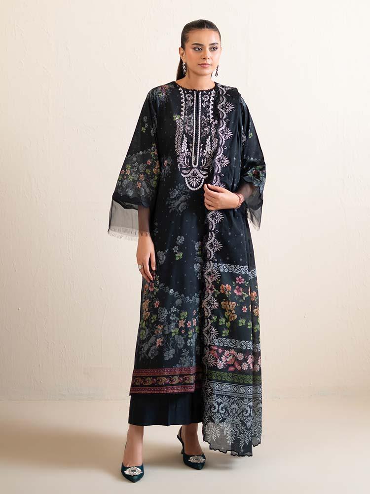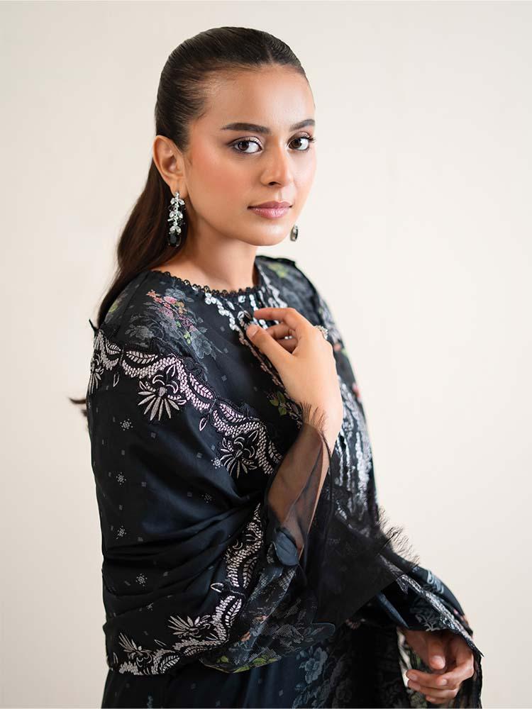 This ensembleis Set against a deep, mysterious Ebony Black base, this ensemble features a stunning play of digital prints and intricate craftsmanship. The shirt is highlighted by a beautifully embroidered neckline that contrasts perfectly with the dark fabric, while the matching dupatta boasts delicate cut-work embroidery, making it a sophisticated choice for evening gatherings or formal day wear.
