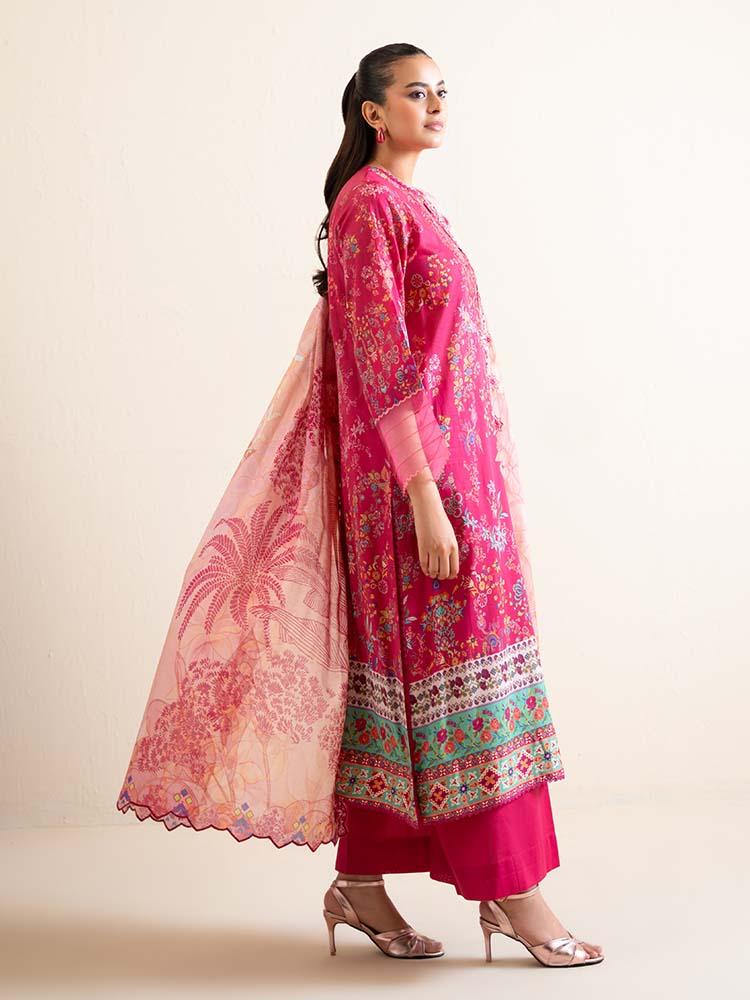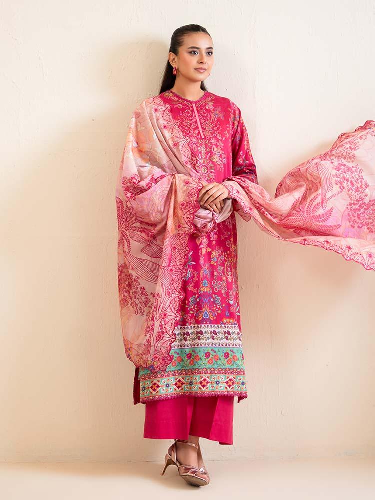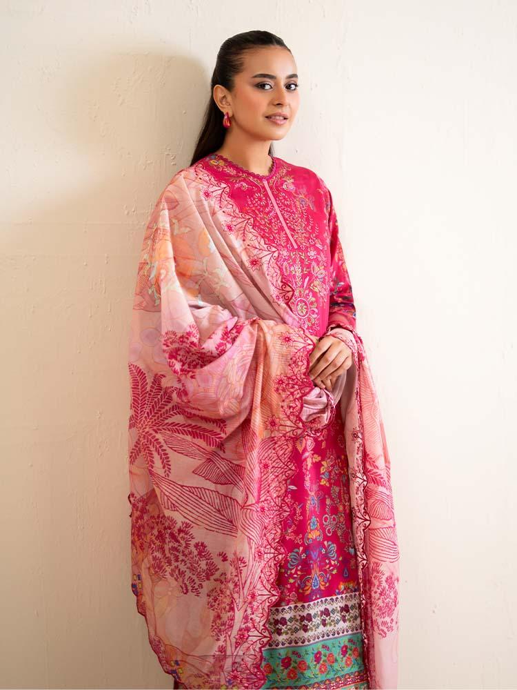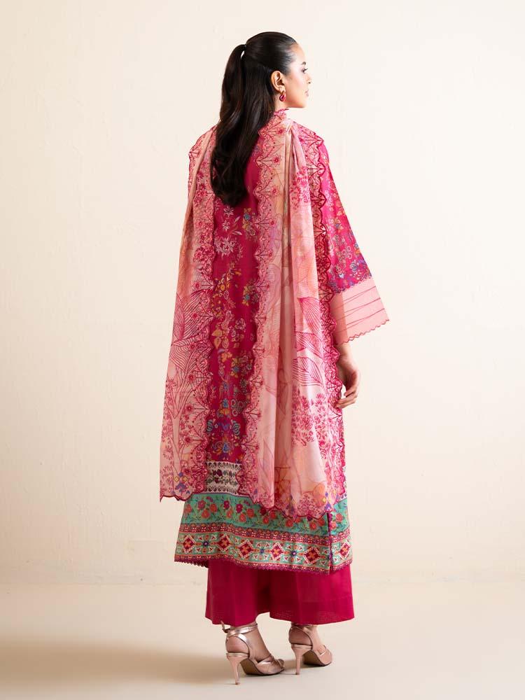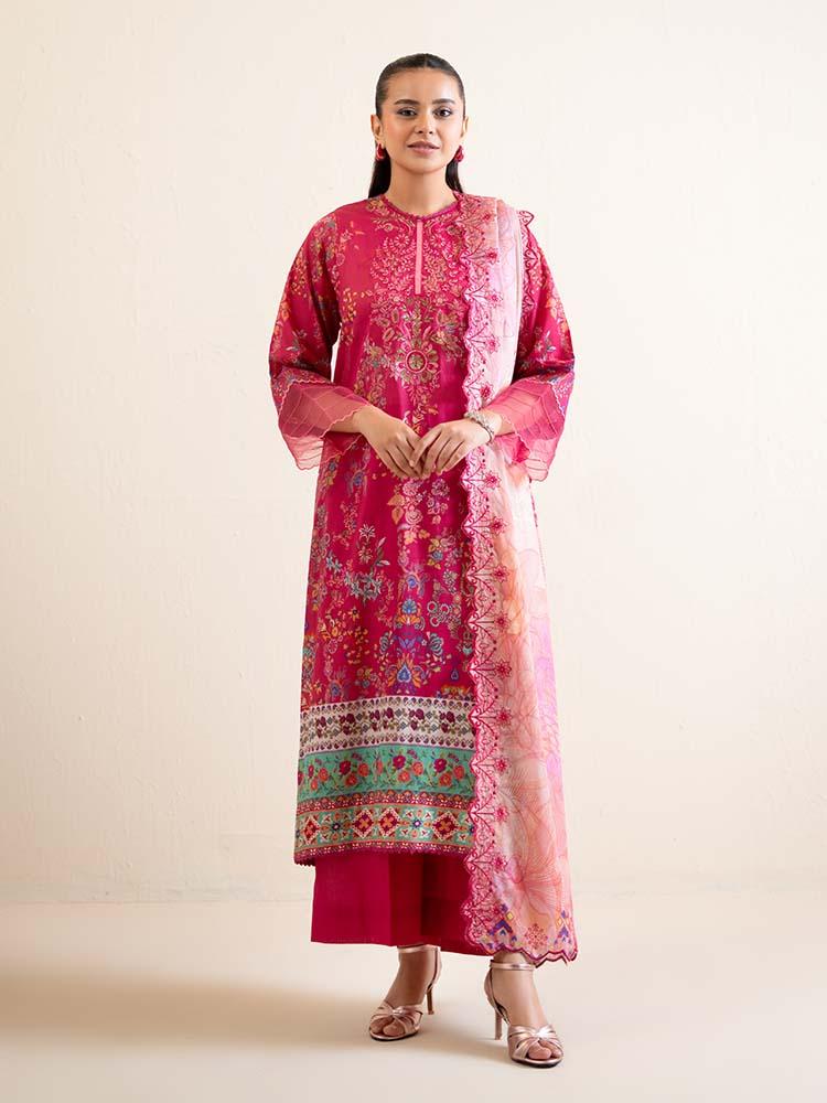 this vibrant ensemble Draped in a striking Magenta Pink, this outfit is a celebration of bold color and intricate detail. The digital printed lawn shirt features a beautifully embroidered neckline that adds a regal touch to the floral and geometric motifs. Completed with a delicately embroidered cut-work dupatta, this set is an ideal choice for festive occasions or stylish evening wear.