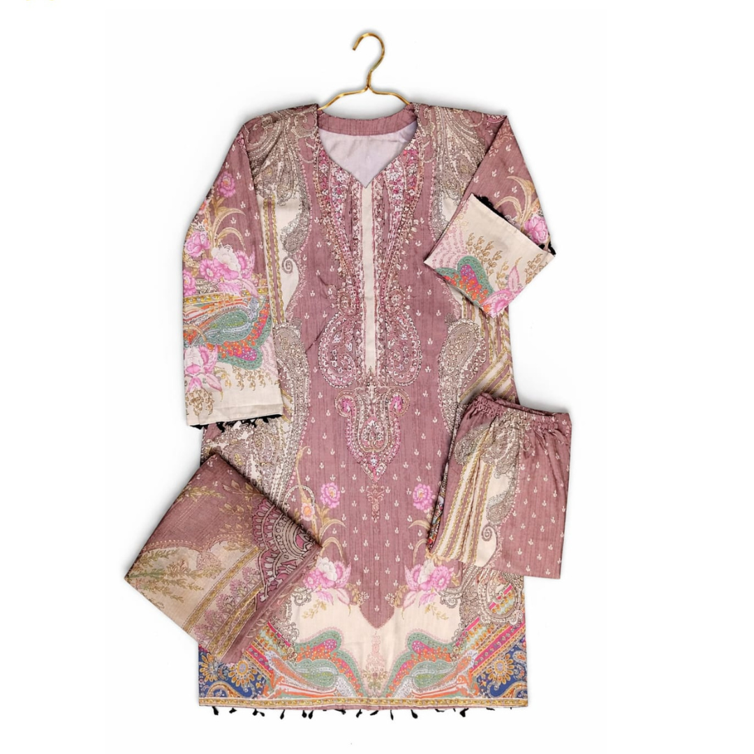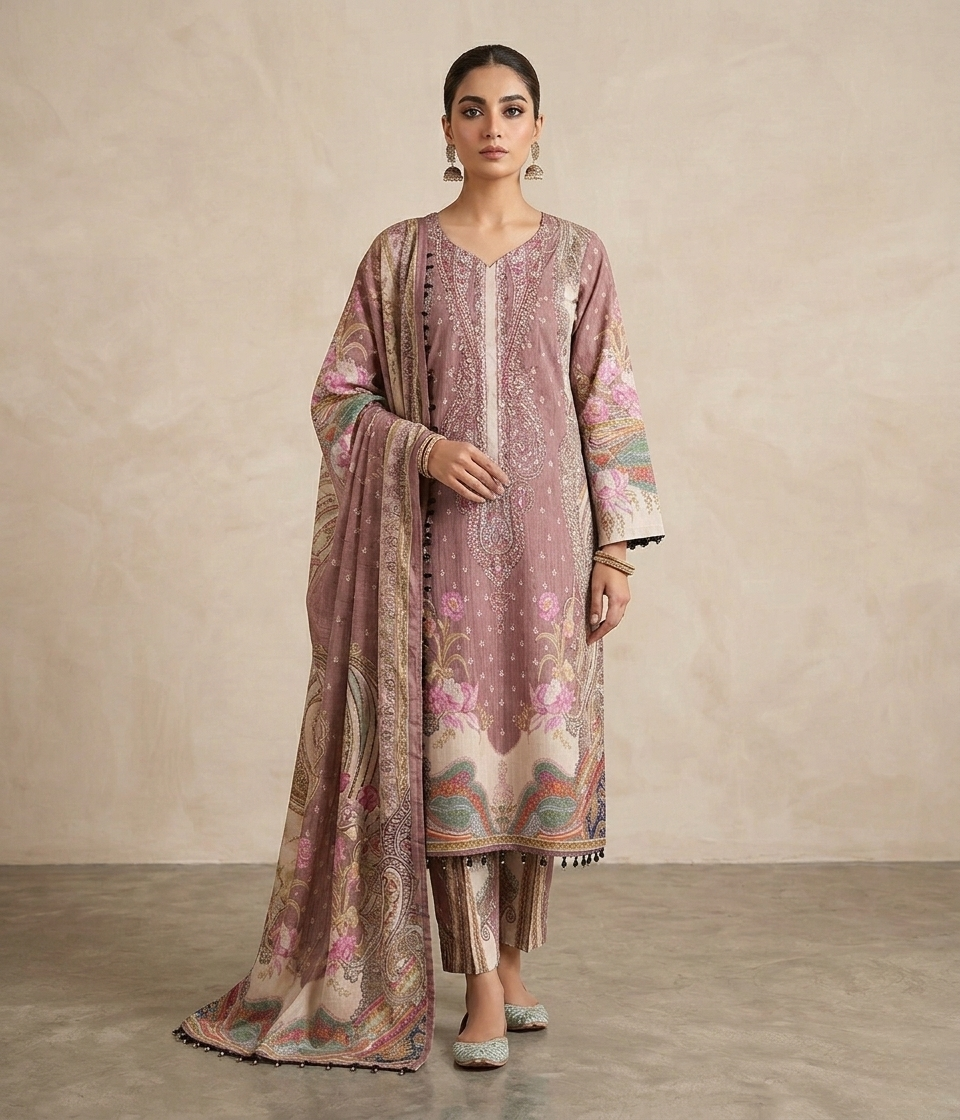 Exude a soft and powerful grace with this Pakistani Inspired Digital Print Three-Piece, a perfect ensemble for those who appreciate the intersection of delicate aesthetics and high-fashion luxury. This set features a sophisticated dusty rose palette with intricate floral accents, providing a wealthy and aristocratic presence at any gathering.