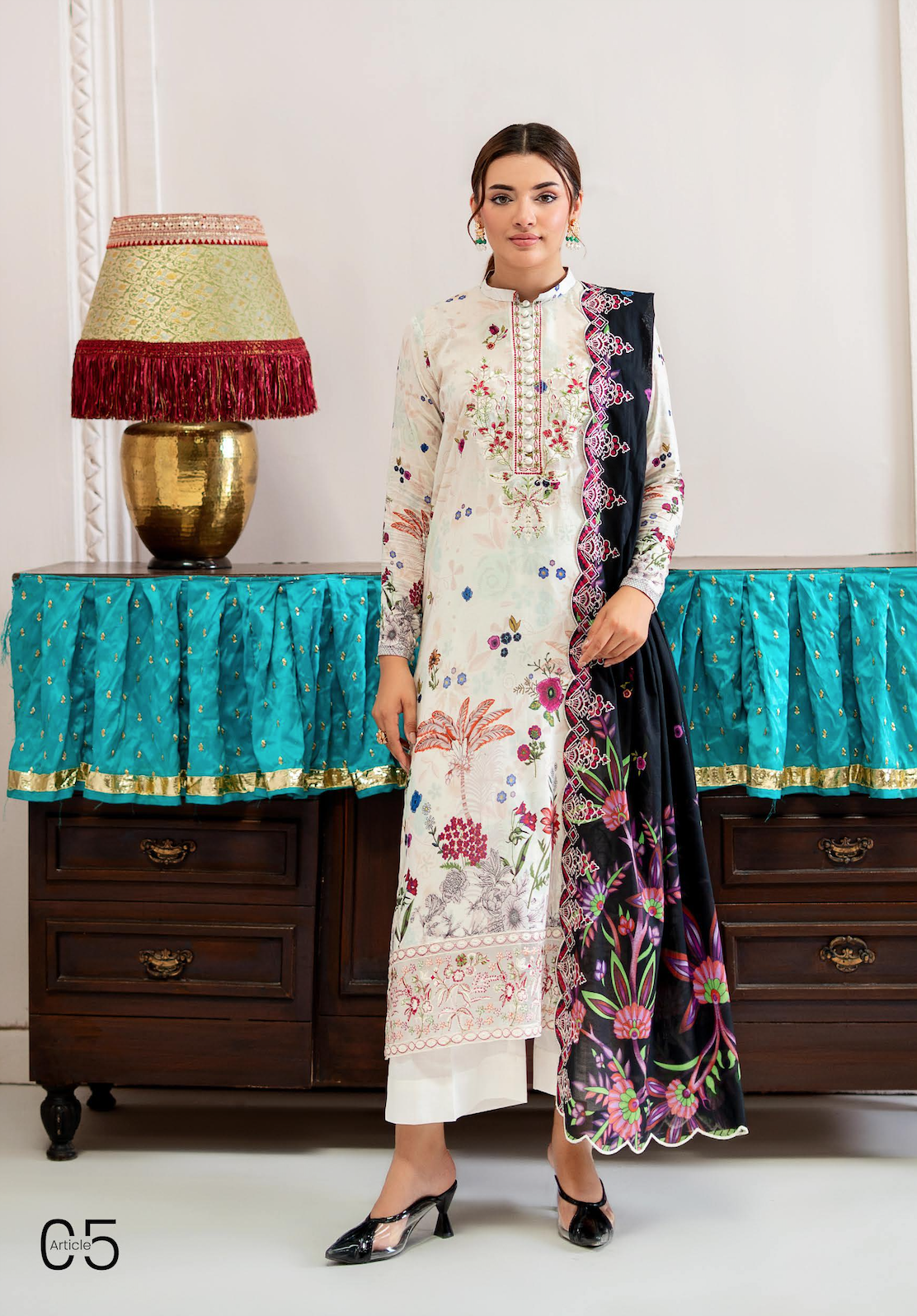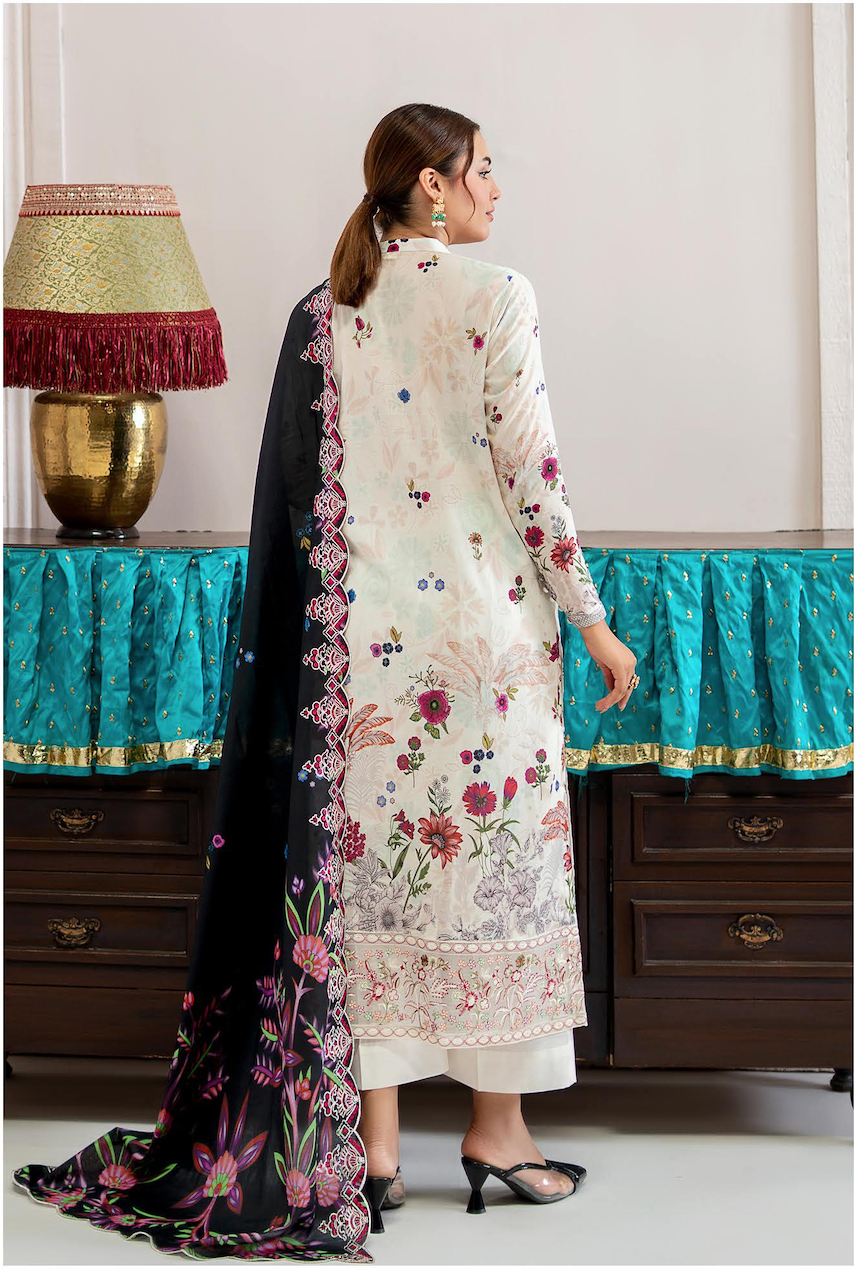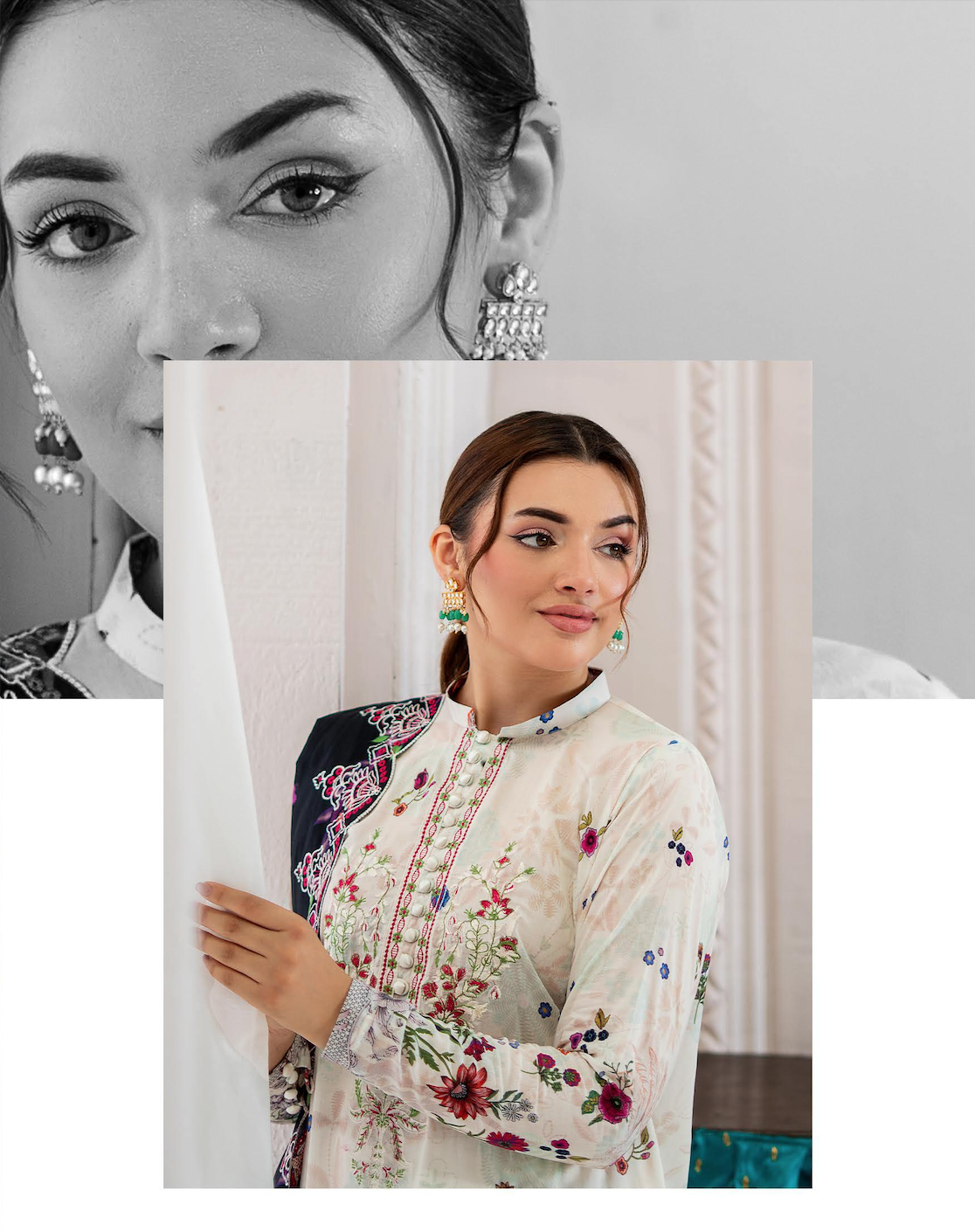 Intricate Front Detail: The Digital Printed Bana Dora Lawn shirt is elevated with delicate ring embroidery on the front, featuring a beautifully worked placket and scattered floral motifs.