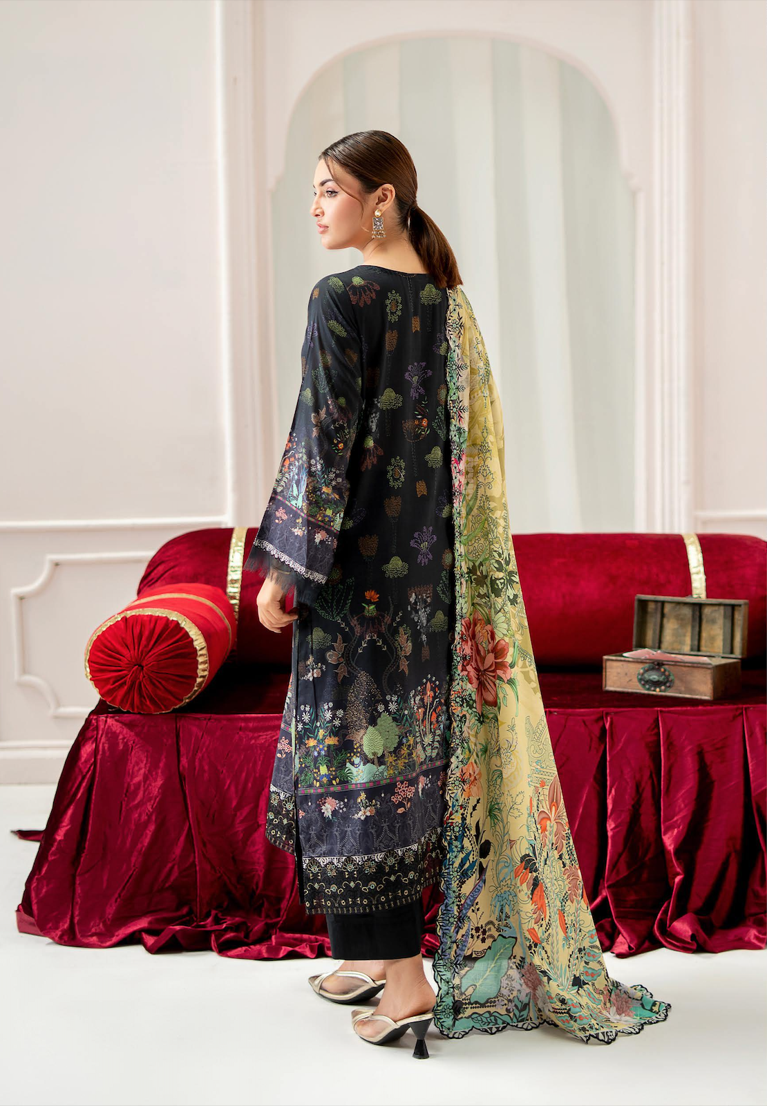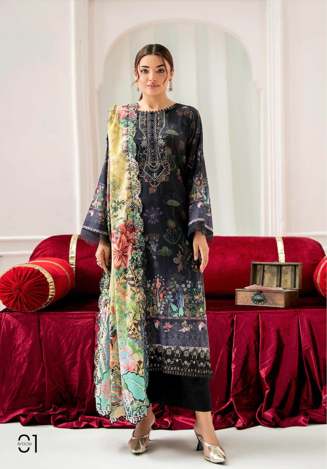 This ensemble Featuring a deep, mysterious Midnight Black base, this outfit showcases the perfect harmony between traditional artistry and modern design. The shirt is crafted from premium digital printed bana dora lawn, highlighted by intricate ring embroidery and vibrant floral motifs. Paired with a luxurious zari lawn jacquard border dupatta, this set is a refined choice for both formal gatherings and elevated everyday wear.