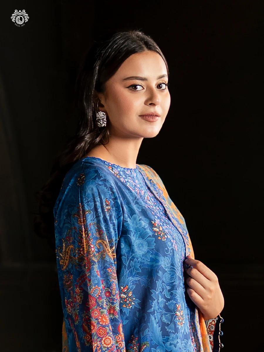 Dive into the depths of style with this captivating 3-piece digital printed lawn suit. Featuring a rich Royal Blue base, this outfit is adorned with kaleidoscopic ethnic patterns and a delicate embroidered neckline. The contrast of the warm mustard and peach tones in the dupatta adds a sun-kissed glow to the cool blue palette, making it a perfect choice for those who love bold, high-contrast fashion.