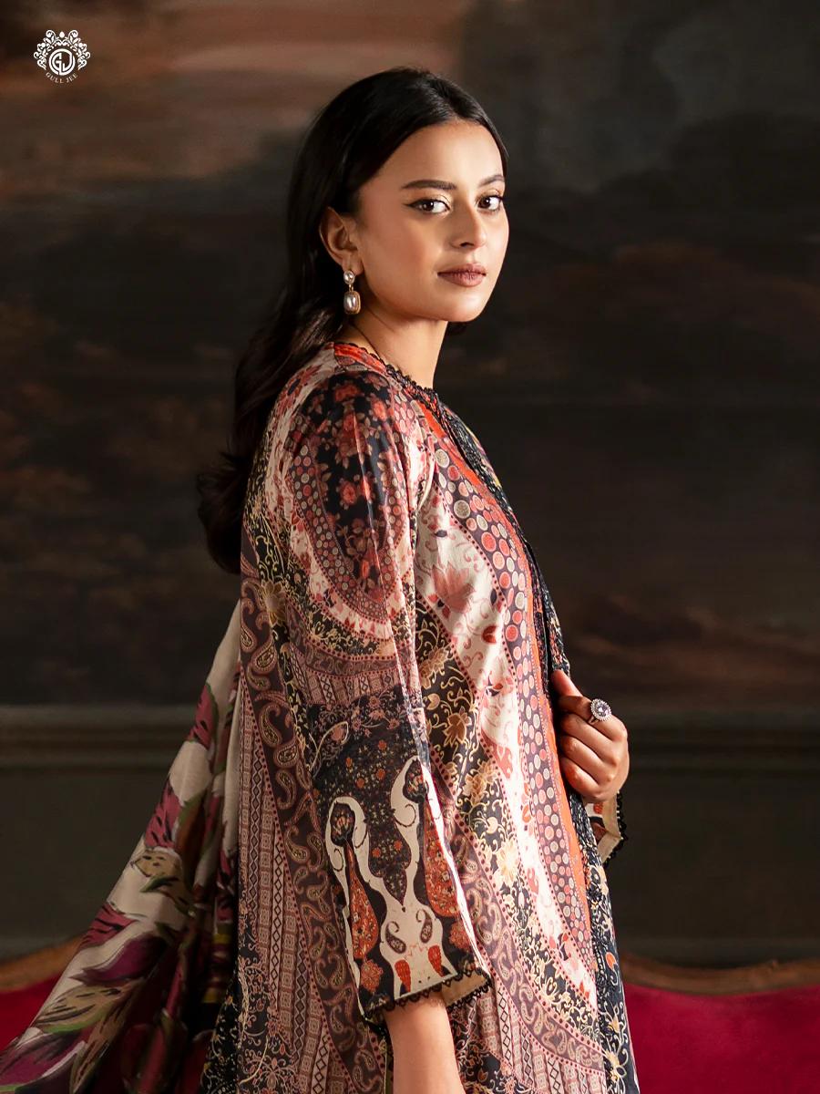 Redefine your wardrobe with this sophisticated digital printed lawn suit. This outfit features a striking Rust & Cream palette accented by deep charcoal and magenta floral highlights. The centerpiece is a meticulously embroidered neckline that adds a touch of regal elegance